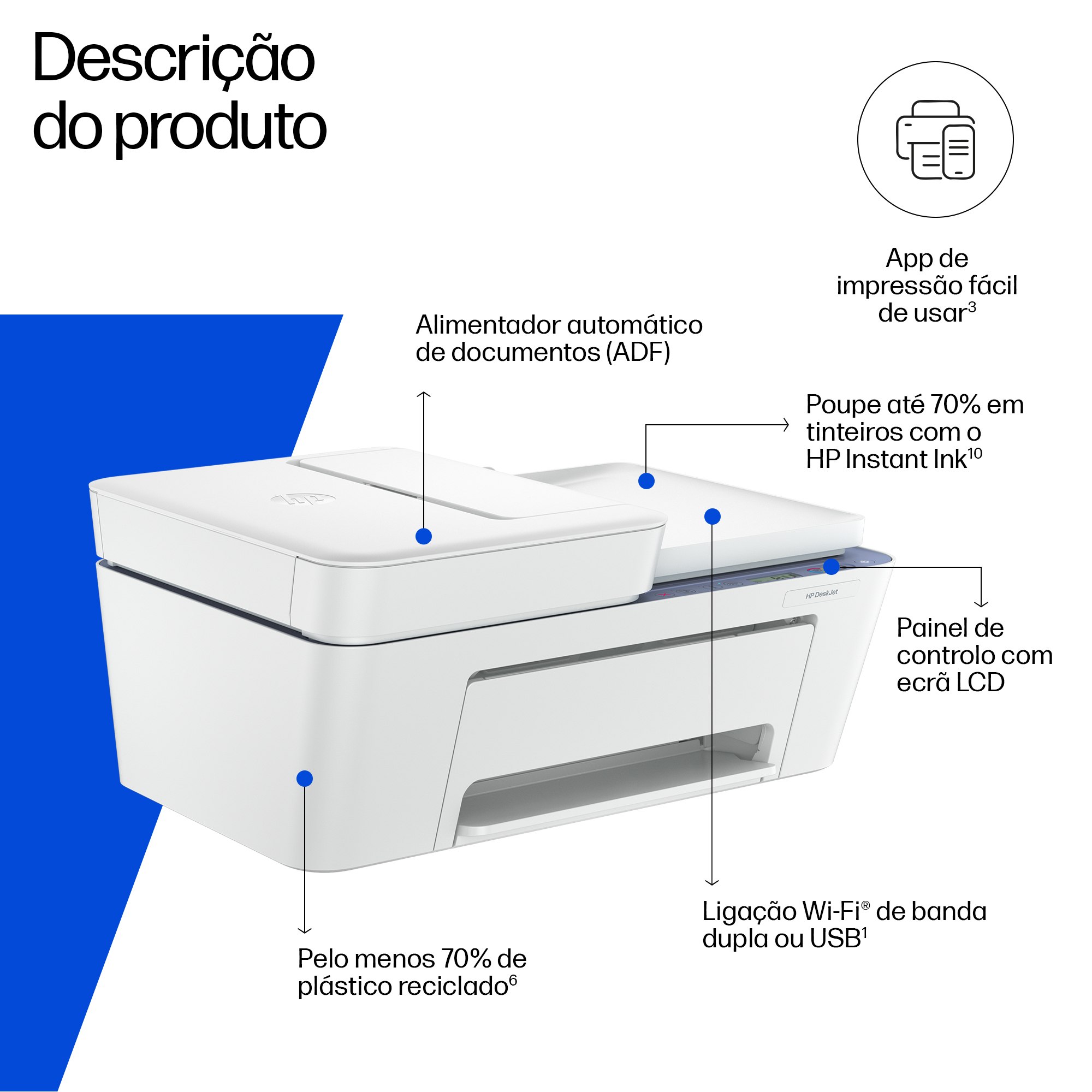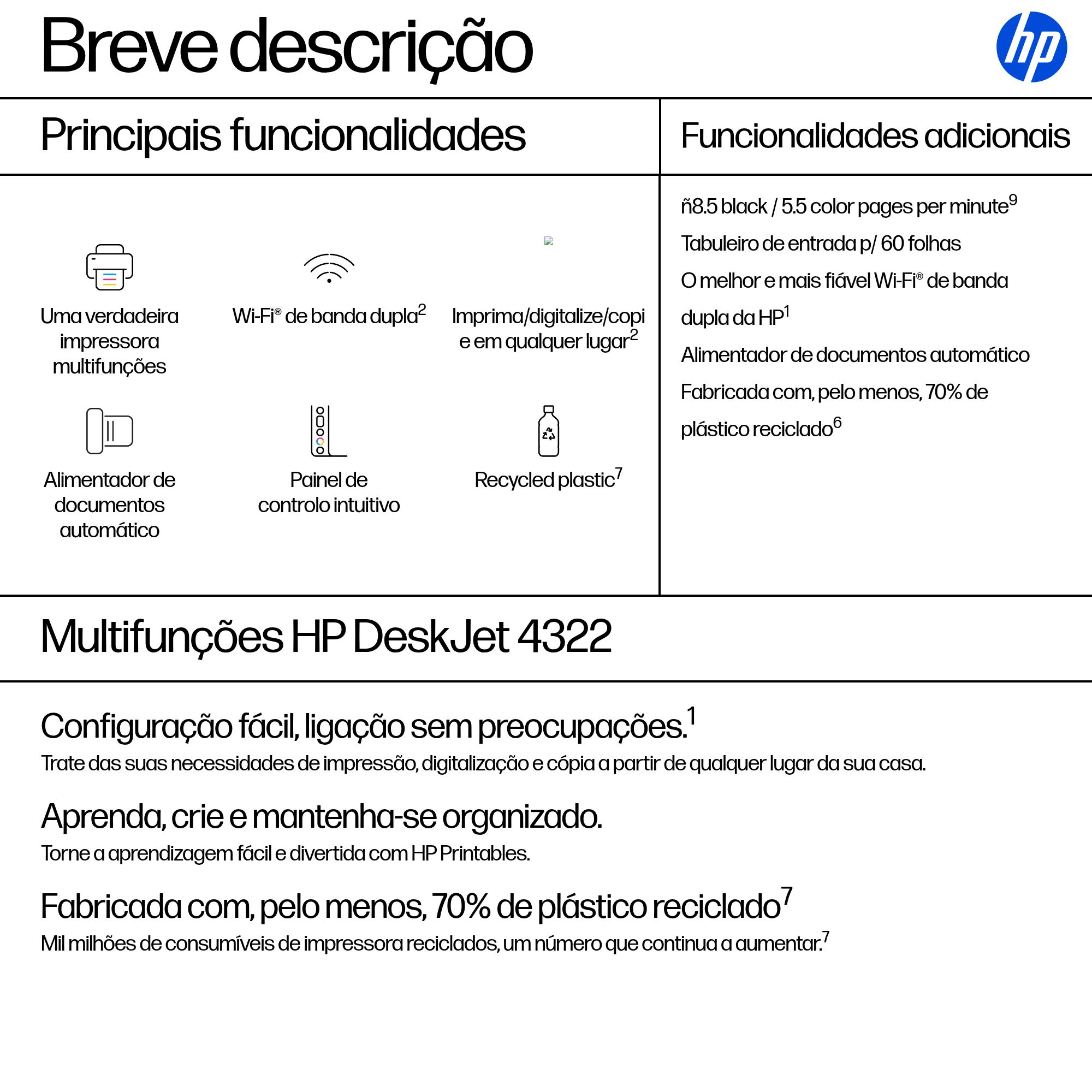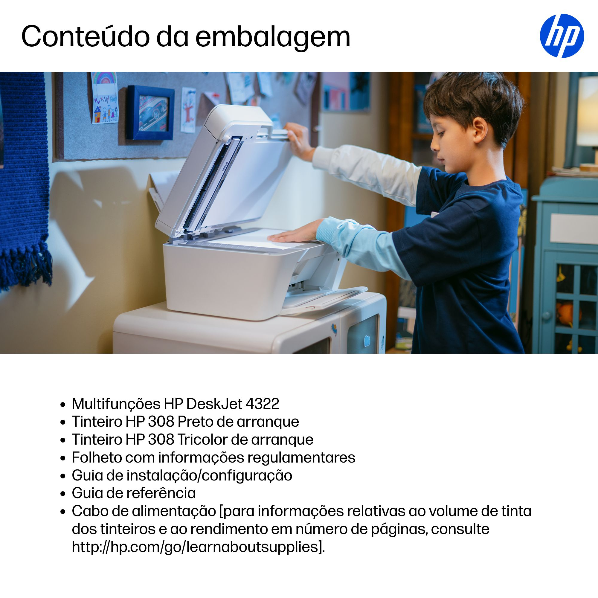 | Conteúdos | Multifunções HP DeskJet 4322; Tinteiro HP 308 Preto de arranque; Tinteiro HP 308 Tricolor de arranque; Folheto com informações regulamentares; Guia de instalação/configuração; Guia de referência; Cabo de alimentação [para informações relativas ao volume de tinta dos tinteiros e ao rendimento em número de páginas, consulte http://hp.com/go/learnaboutsupplies]. |