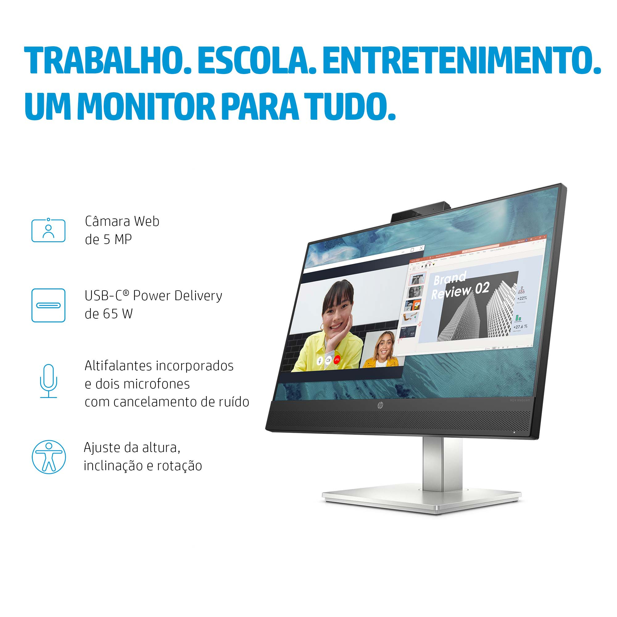 Faça videoconferências e ligue-se facilmente com o Monitor de Videoconferência HP E24m G4 com USB-C e certificado para Zoom, que incorpora uma câmara Web de 5 MP com ajuste da inclinação, altifalantes de projeção frontal e dois microfones. Trabalhe comodamente e simplifique o seu setup com um cabo USB-C[1] para dados, vídeo e fornecimento de energia para o portátil até 65 W.