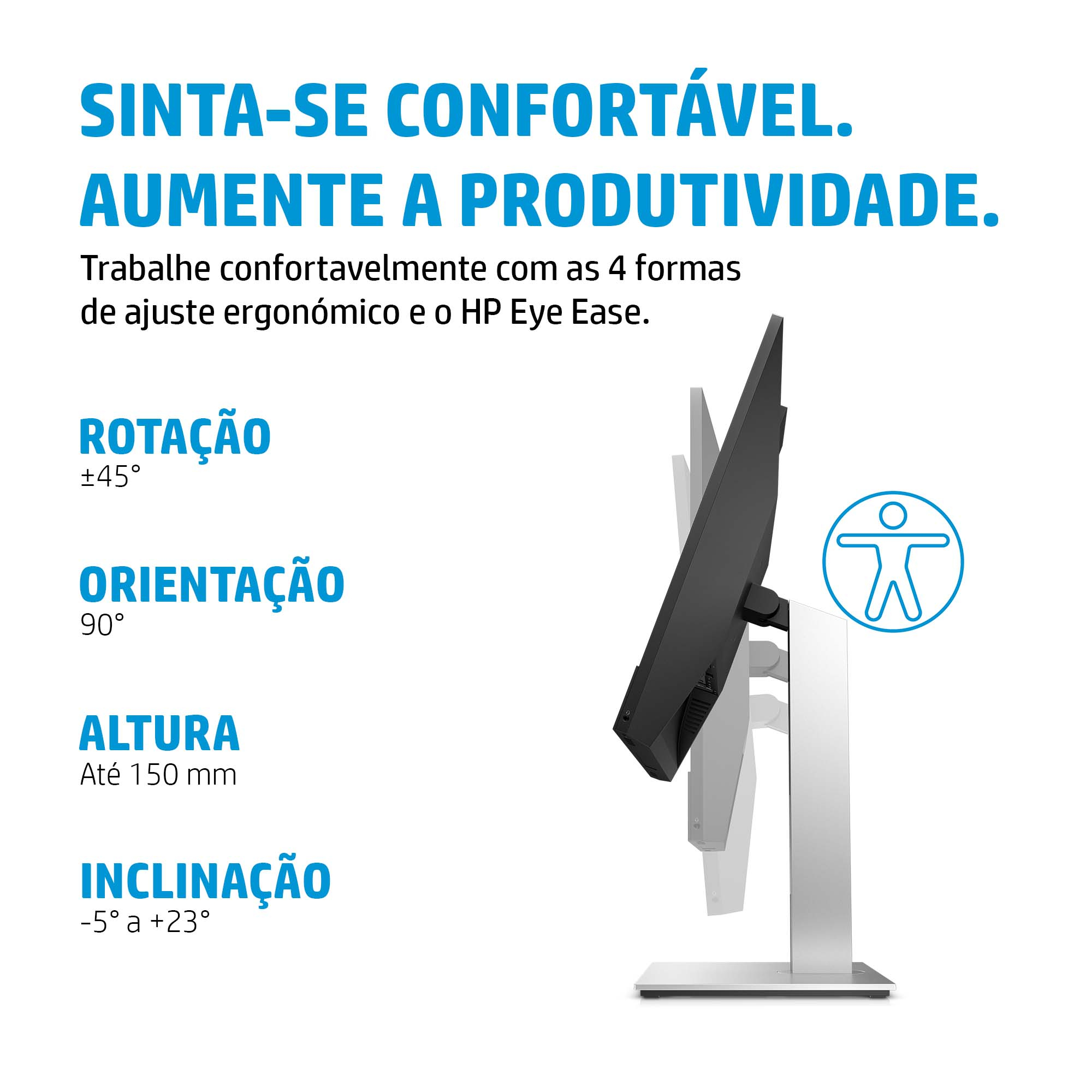 Trabalhe sem esforço com as 4 formas de ajuste ergonómico e visualize confortavelmente o seu trabalho num ecrã FHD de 60,45 cm (23,8 polegadas) que reduz a emissão de luz azul com o HP Eye Ease.