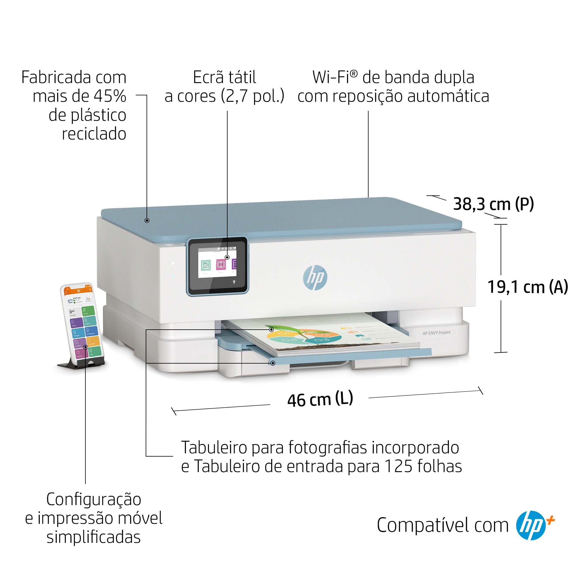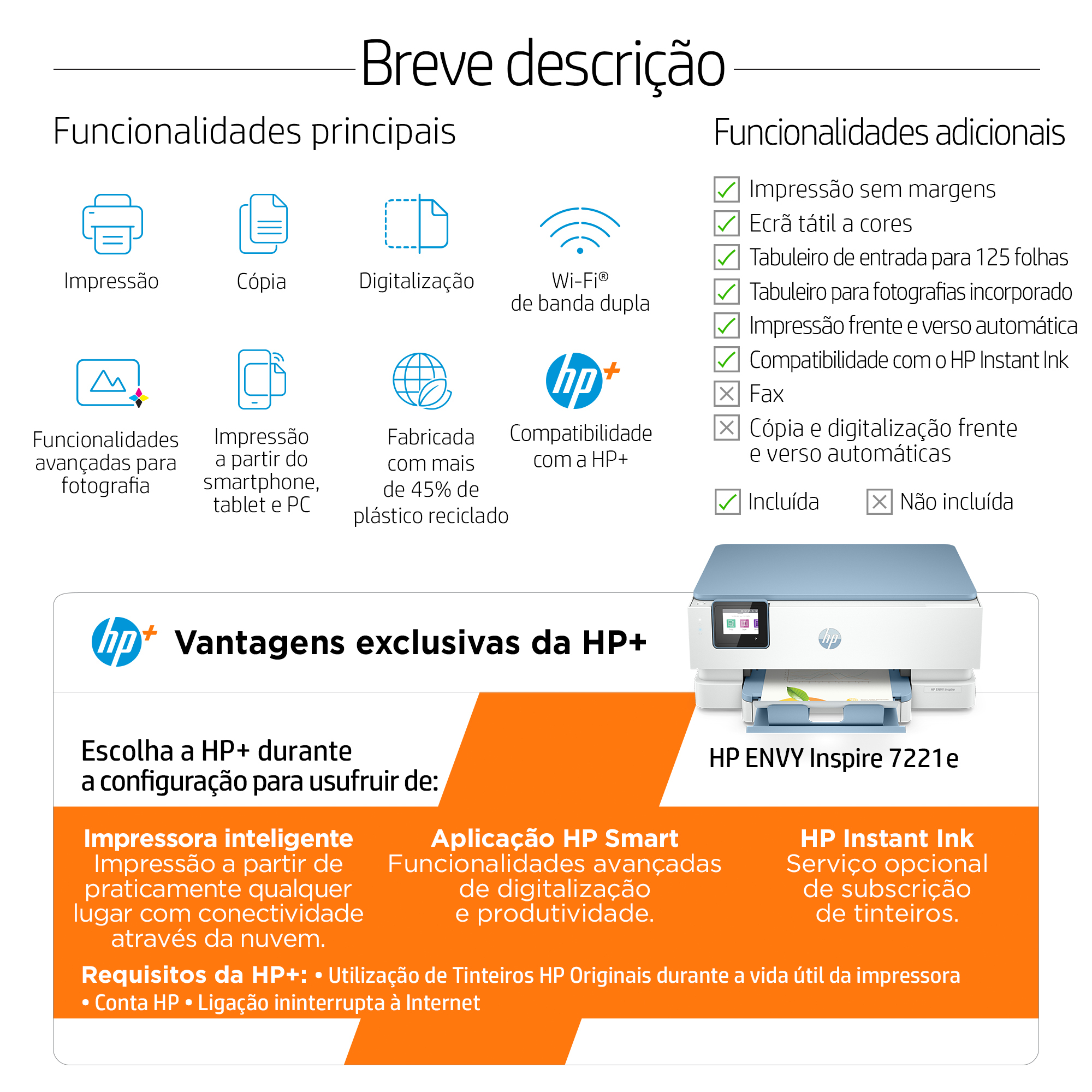 Esta é uma impressora compatível com o HP+. Escolha o HP+ no processo de configuração da impressora para ativar os benefícios/vantagens. O HP+ requer uma conta HP, ligação ininterrupta à Internet e a utilização exclusiva de Tinteiros HP Originais durante a vida útil da impressora. Saiba mais em: http://www.hp.com/plus