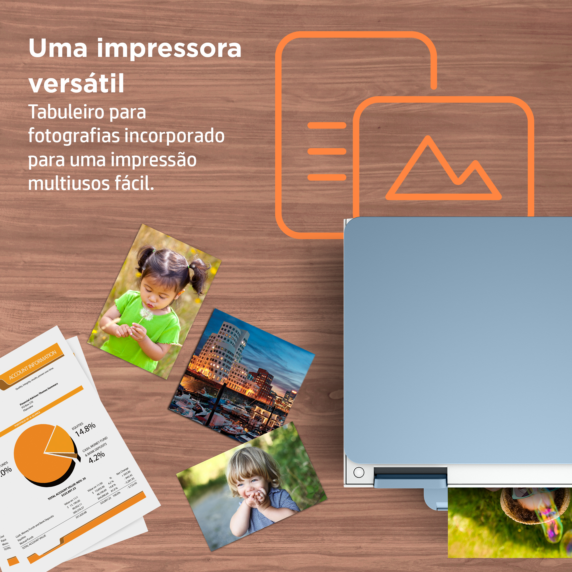 Imprima comodamente fotografias numa diversidade de tamanhos com um tabuleiro para fotografias incorporado.