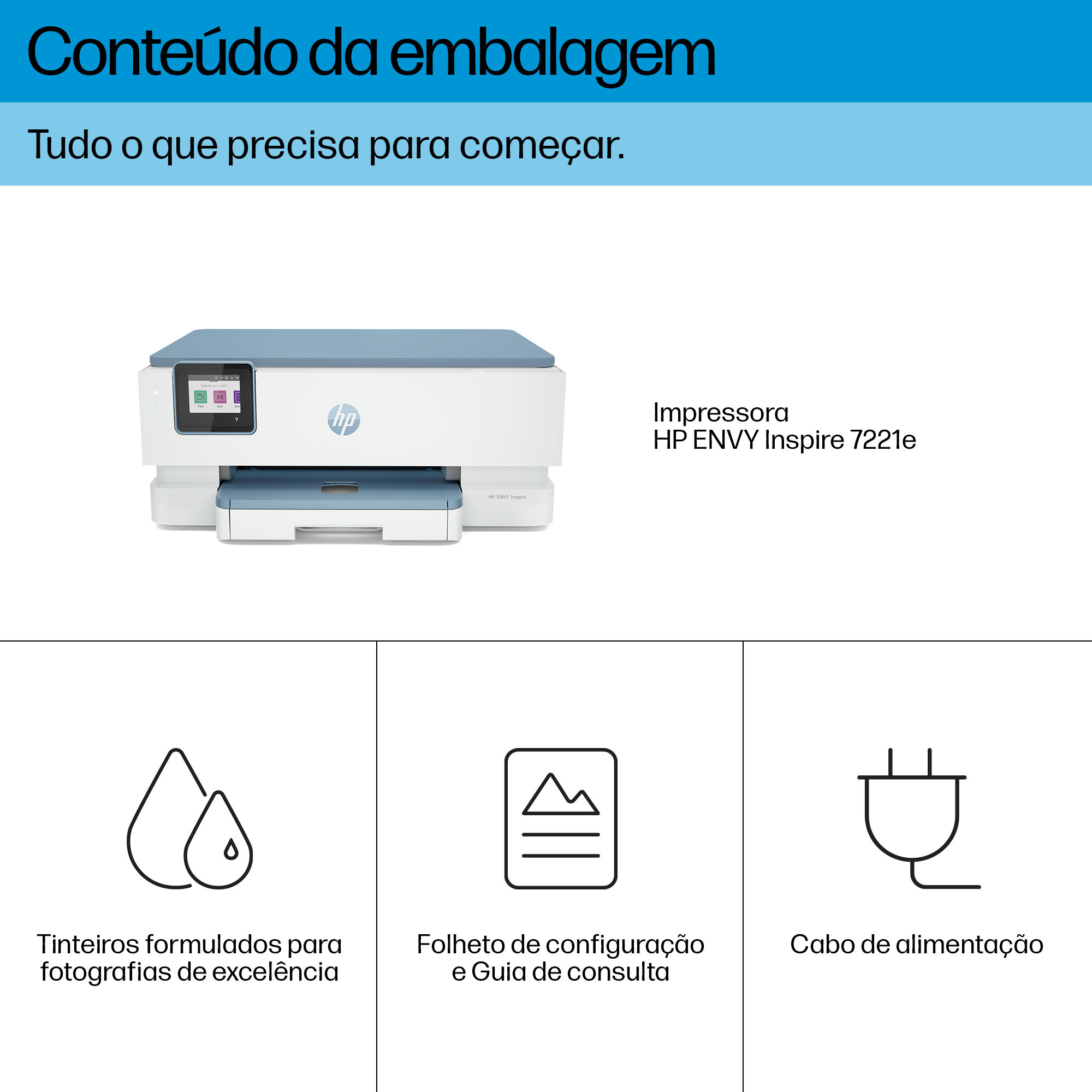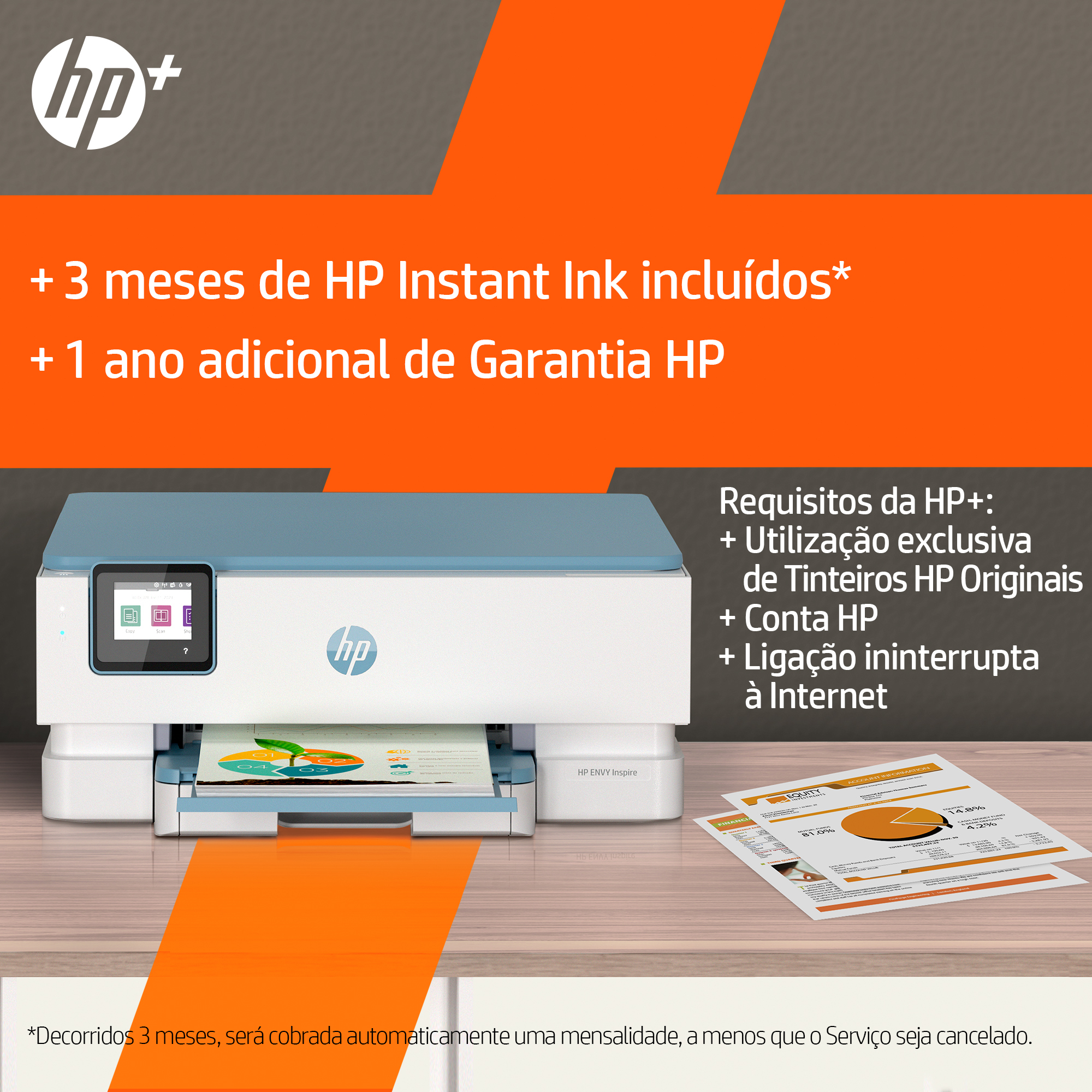 Primeiros 3 meses de HP Instant Ink incluídos[9]; decorridos 3 meses, será cobrada automaticamente uma mensalidade, a menos que o Serviço seja cancelado.
