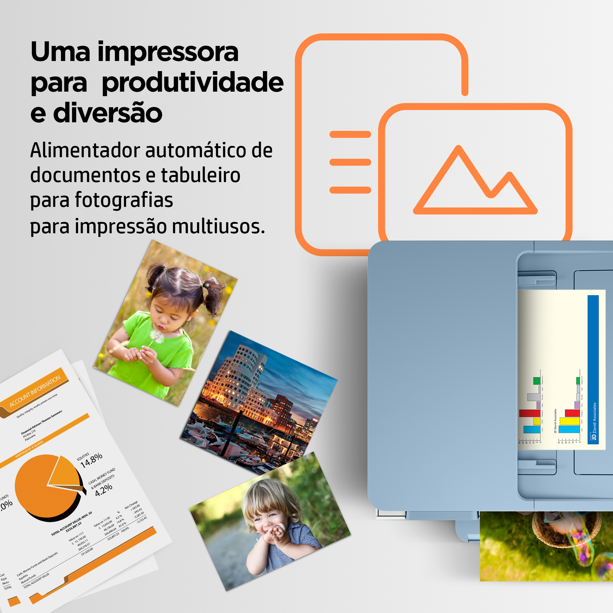 Impressão de fotografias e documentos de alta qualidade com um tabuleiro de fotografias incorporado e alimentador automático de documentos.