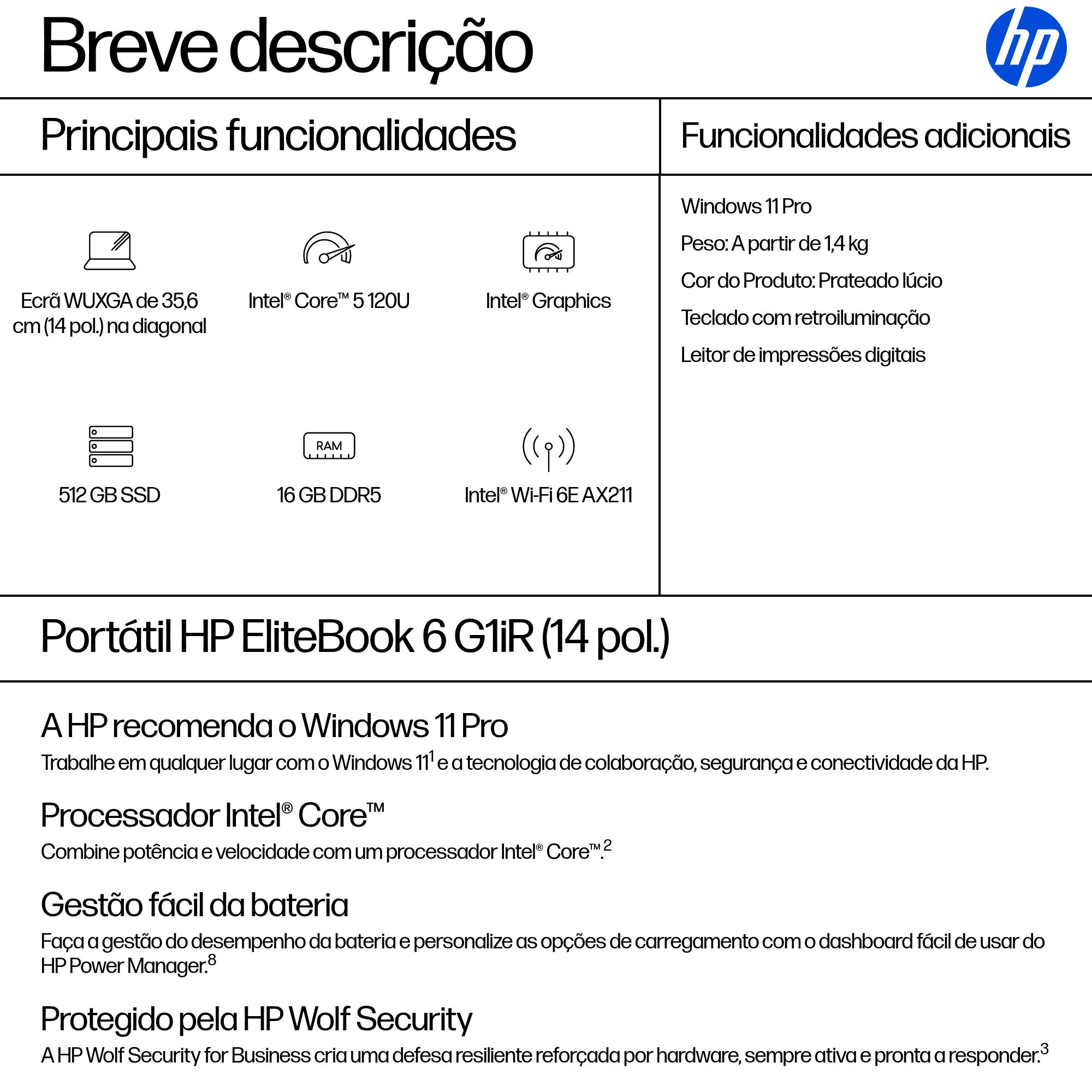 HP EliteBook 6 G1iR 14 inch Notebook PC Intel Core 5 120U Computador portátil 35,6 cm (14") WUXGA 16 GB DDR5-SDRAM 512 GB SSD Wi-Fi 6E (802.11ax) Windows 11 Pro