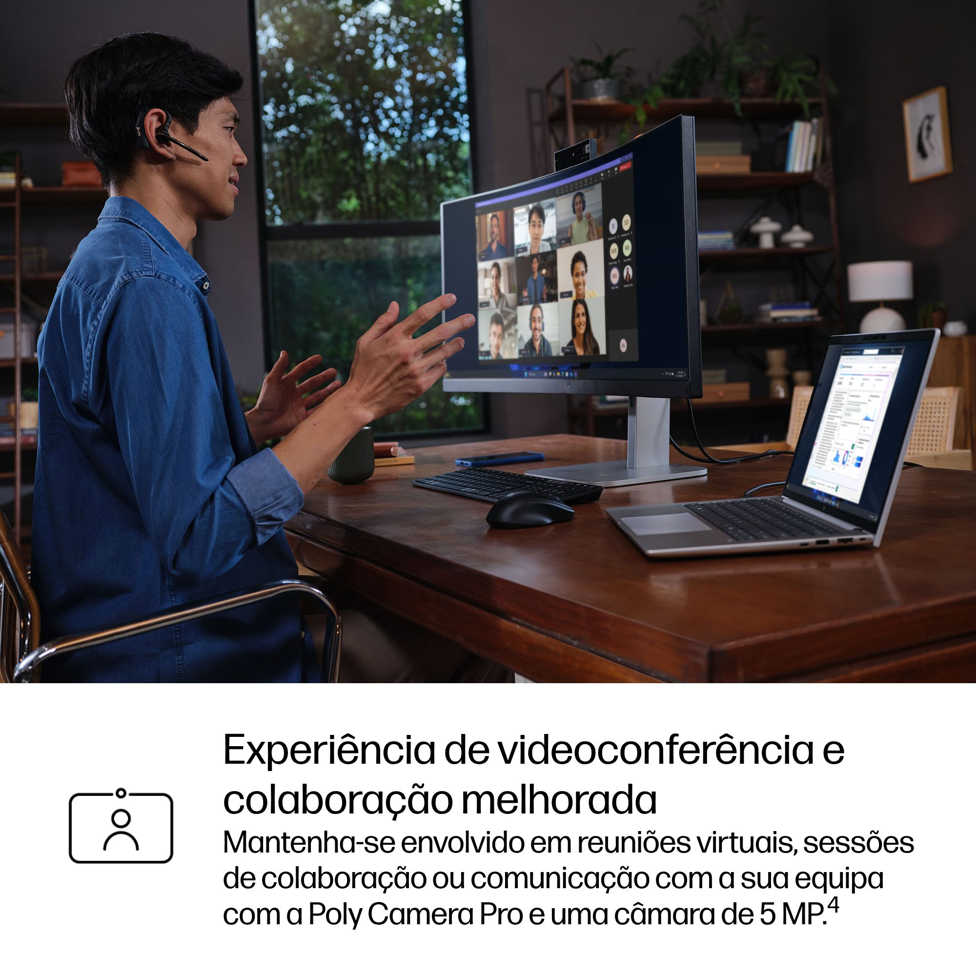 Apresente-se no seu melhor nas videochamadas e poupe energia. Faça a gestão dos seus controlos de vídeo para câmaras internas e externas com a Poly Camera Pro. Agora, o Enquadramento automático, o Spotlight, a Desfocagem do fundo e os fundos virtuais poupam energia ao serem executados na NPU.[10]