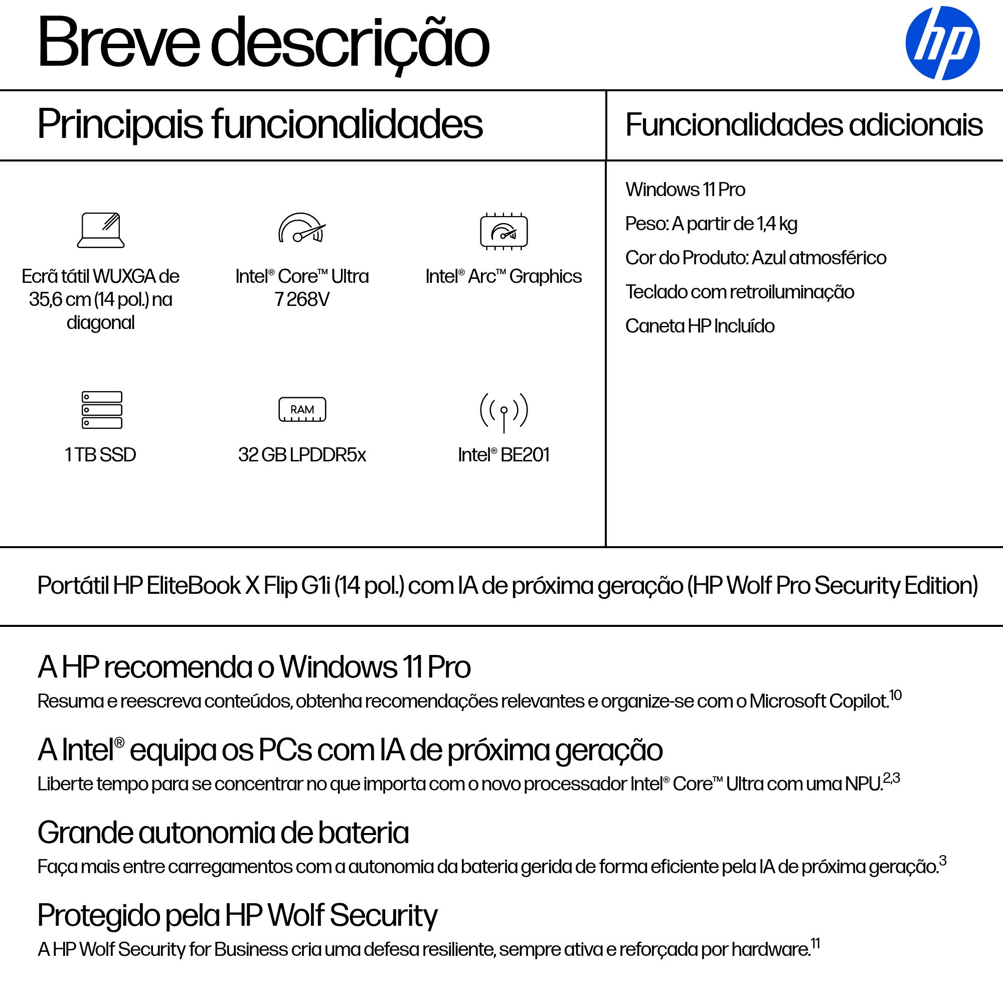 Portátil HP EliteBook X Flip G1i (14 pol.) com IA de próxima geração (HP Wolf Pro Security Edition), 14", Ecrã tátil, Windows 11 Pro, Intel Core™ Ultra 7, 32GB RAM, 1TB SSD, WUXGA