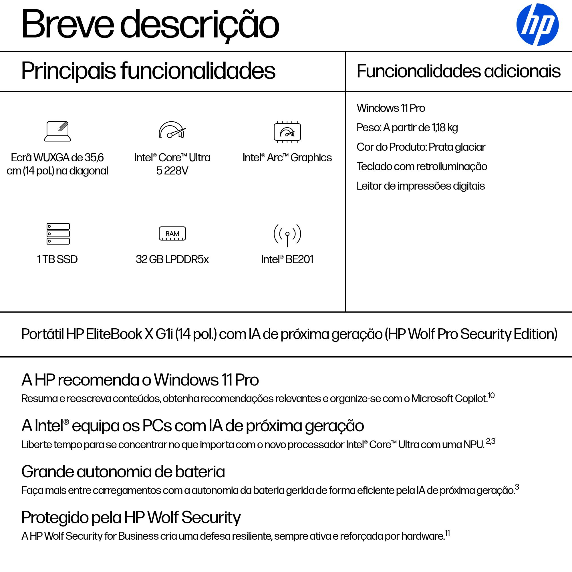 HP EliteBook X G1i 14 inch Notebook Next Gen AI PC Wolf Pro Security Edition Copilot+ PC Intel Core Ultra 5 228V Computador portátil 35,6 cm (14") WUXGA 32 GB LPDDR5x-SDRAM 1 TB SSD Wi-Fi 7 (802.11be) Windows 11 Pro Prateado