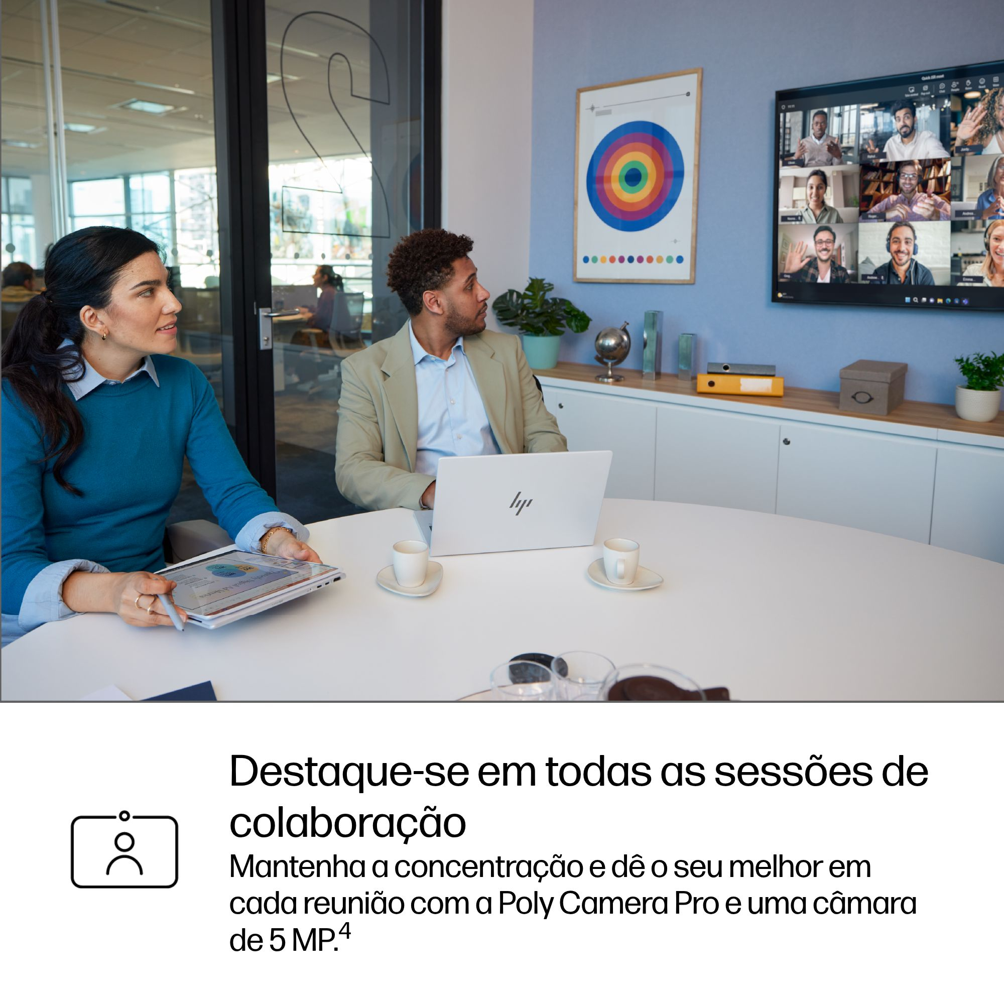Apresente-se no seu melhor nas videochamadas e poupe energia. Faça a gestão dos seus controlos de vídeo para câmaras internas e externas com a Poly Camera Pro. Agora, o Enquadramento automático, o Spotlight, a Desfocagem do fundo e os fundos virtuais poupam energia ao serem executados na NPU.[15]