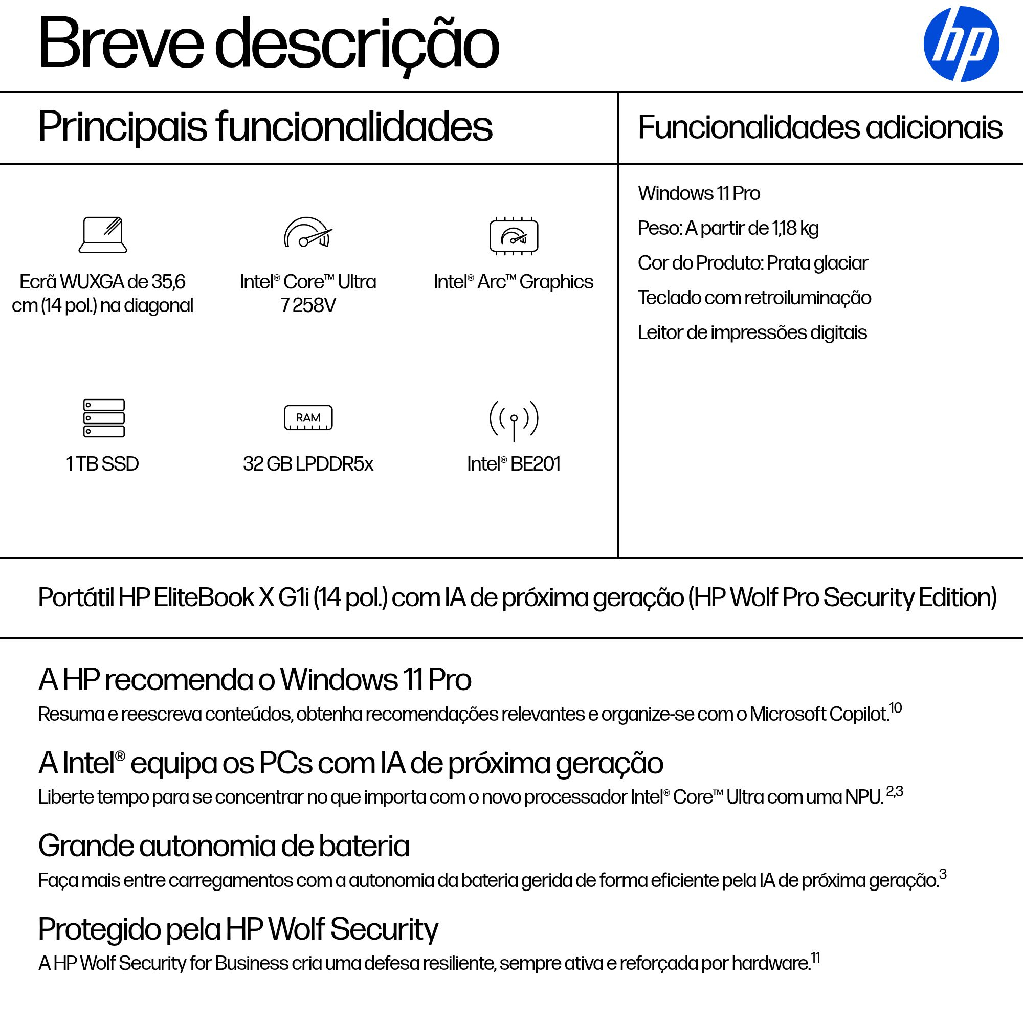 HP EliteBook X G1i 14 inch Notebook Next Gen AI PC Wolf Pro Security Edition Copilot+ PC Intel Core Ultra 7 258V Computador portátil 35,6 cm (14") WUXGA 32 GB LPDDR5x-SDRAM 1 TB SSD Wi-Fi 7 (802.11be) Windows 11 Pro Prateado