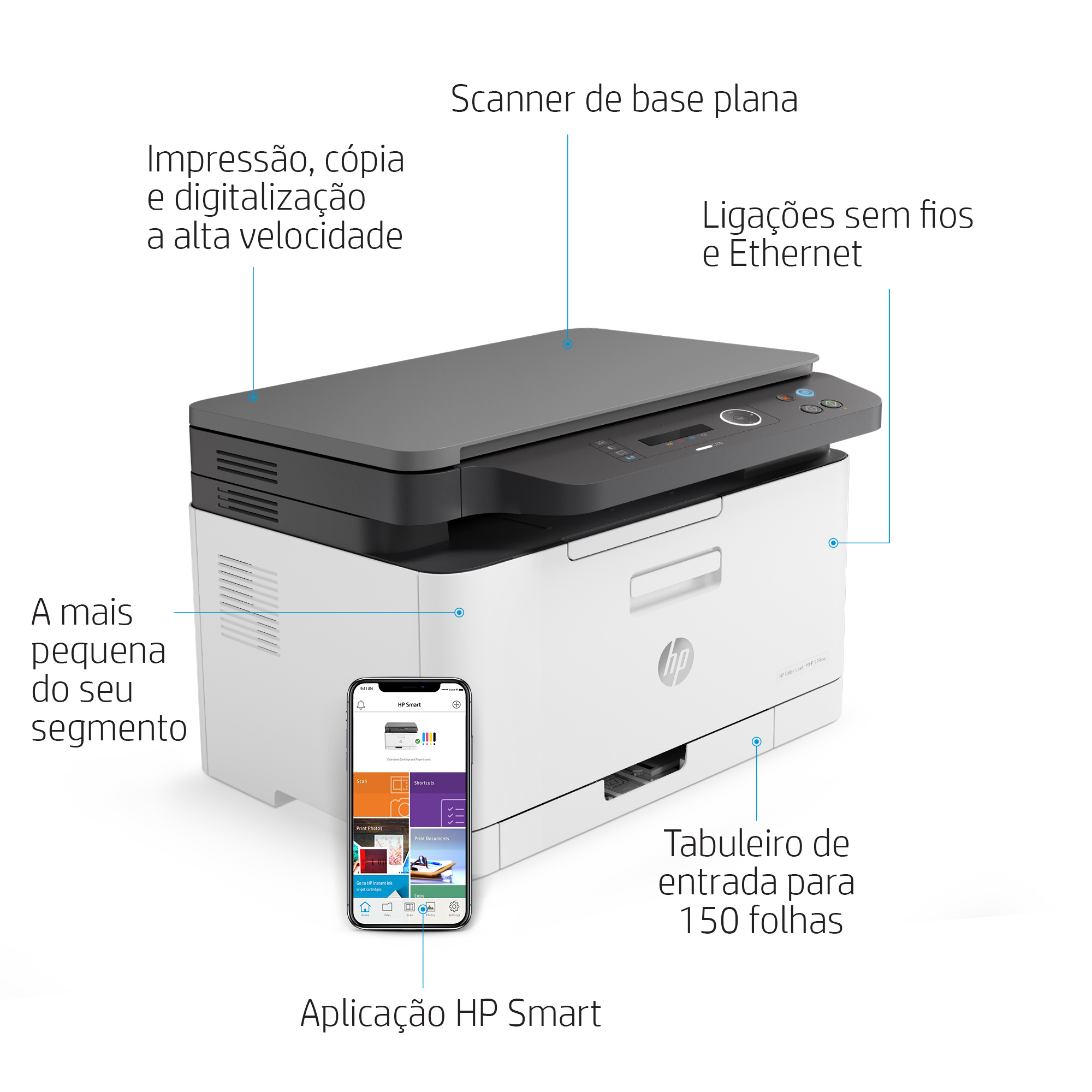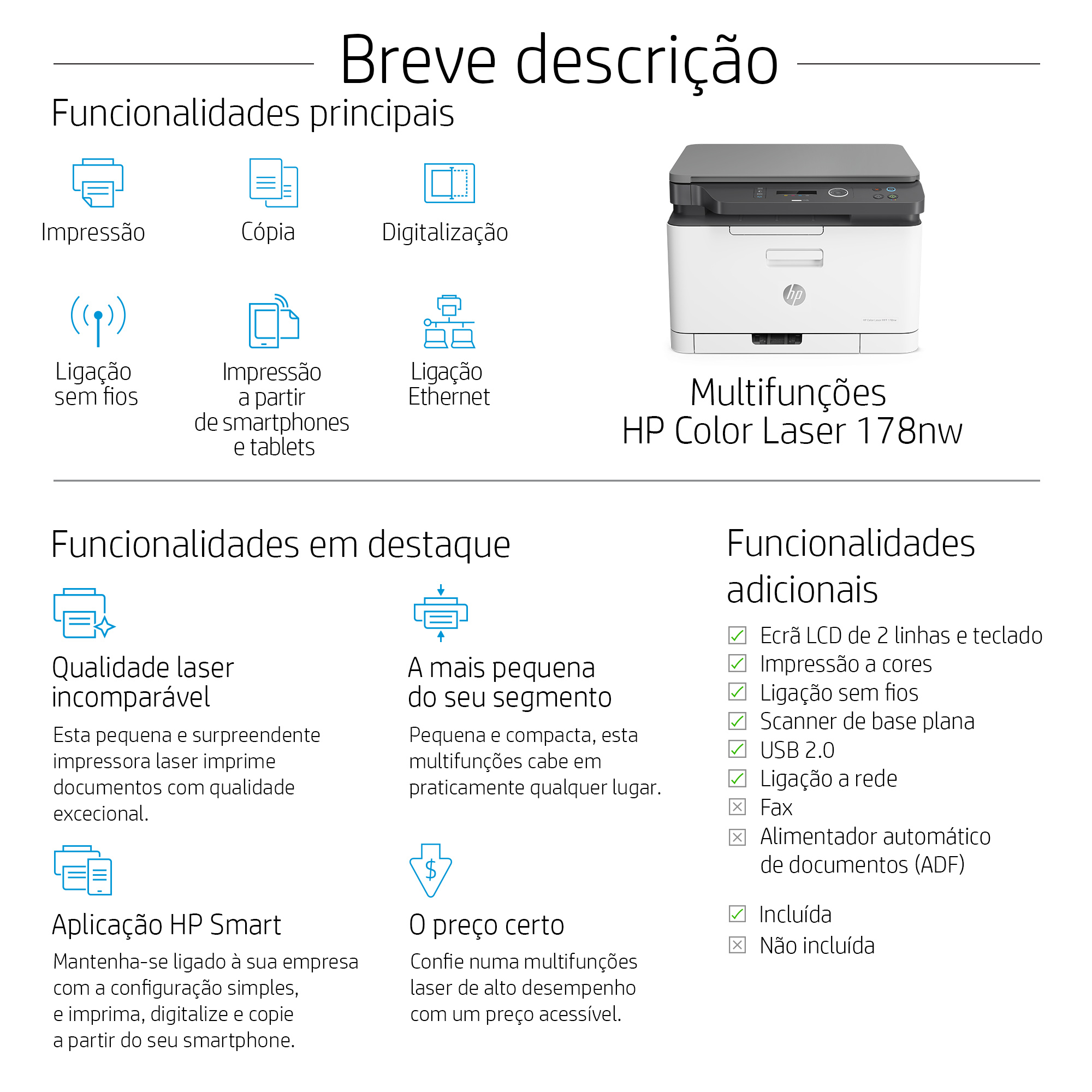 | Conteúdos | Multifunções HP Color Laser 178nw; Consumível HP Laser de inicialização Preto pré-instalado (700 páginas); Consumível HP Laser Ciano pré-instalado (500 páginas); Consumível HP Laser Amarelo pré-instalado (500 páginas); Consumível HP Laser Magenta pré-instalado (500 páginas); Tambor de imagem; Unidade de recolha de toner; Cartaz de configuração; Guia de referência; Folheto com informações de suporte; Guia da garantia; Sem CD-ROM; Cabo de alimentação; Cabo USB |