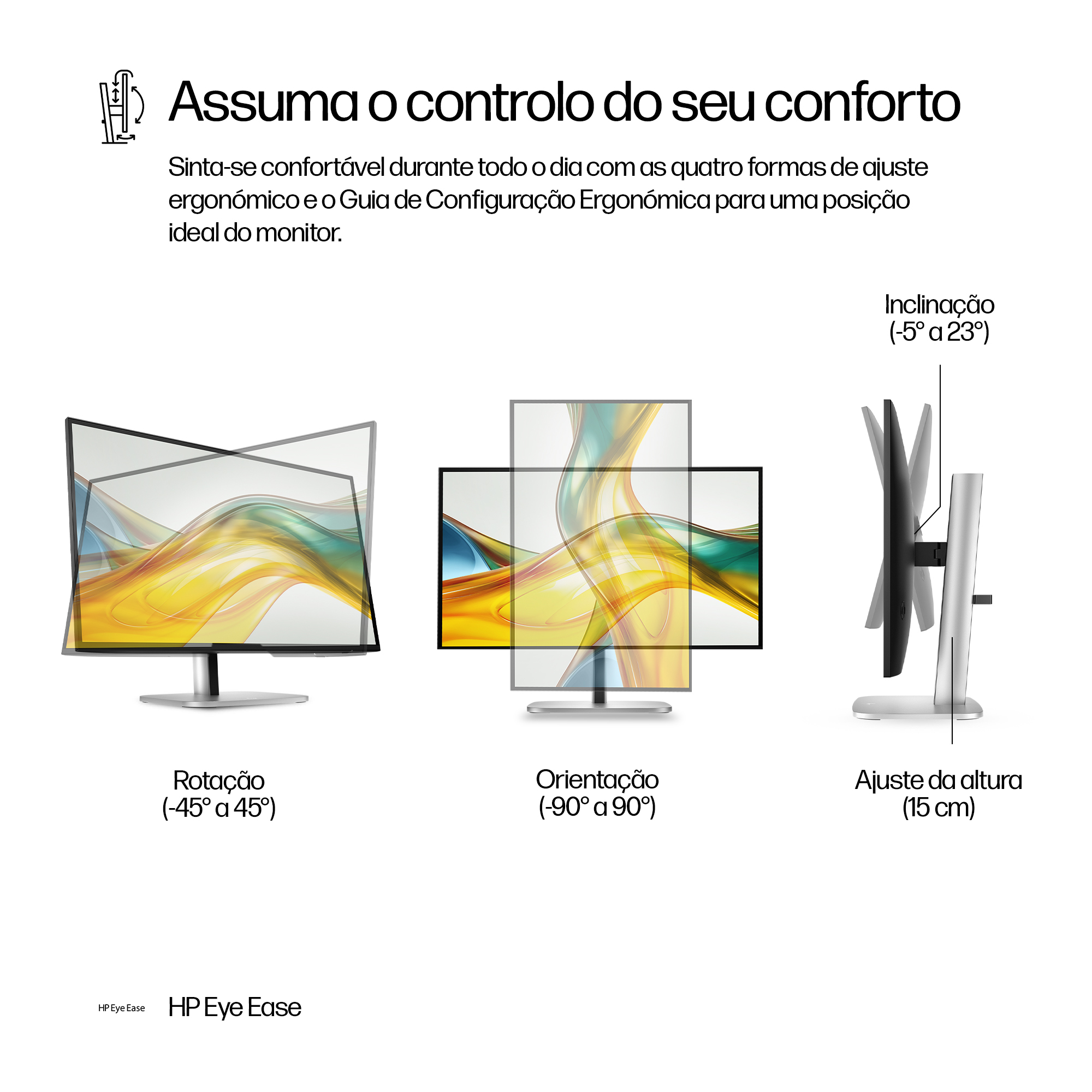 Encontre uma forma de se manter confortável durante todo o dia com as quatro formas de ajuste ergonómico otimizadas pelo Guia de Configuração Ergonómica<sup>[5]</sup> detalhado no HP Display Center.<sup>[9]</sup> Mantenha os seus olhos confortáveis com o HP Eye Ease, que reduz a emissão de luz azul sem afetar a precisão de cor.