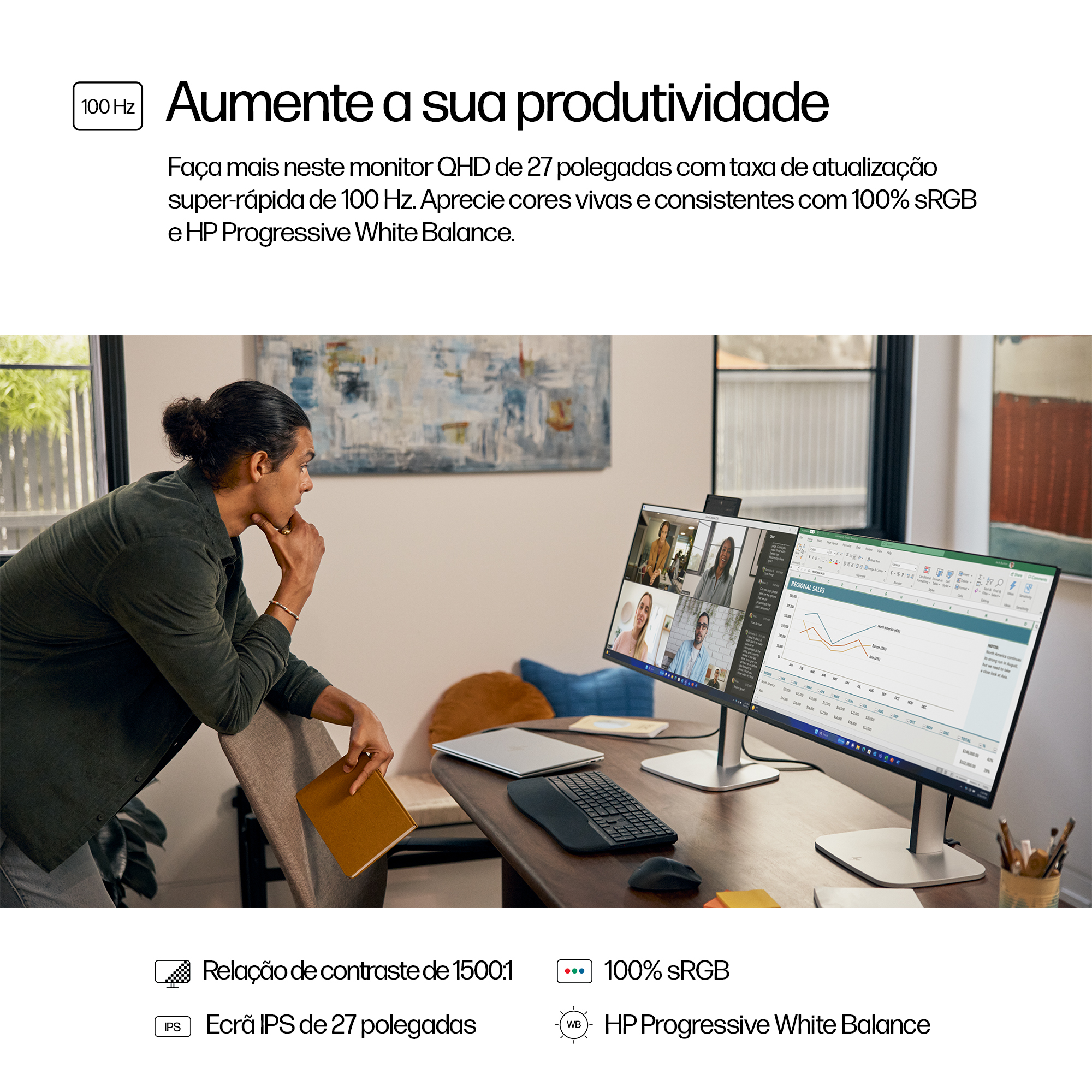 Veja mais do seu trabalho e faça mais neste monitor de 27 polegadas com resolução QHD. Uma taxa de atualização super-rápida de 100 Hz<sup>[1]</sup> realça todos os detalhes. Eleve ainda mais a sua experiência de visualização com cores brilhantes, vivas e consistentes, com 100% sRGB<sup>[1]</sup> e a tecnologia HP Progressive White Balance.<sup>[2]</sup>