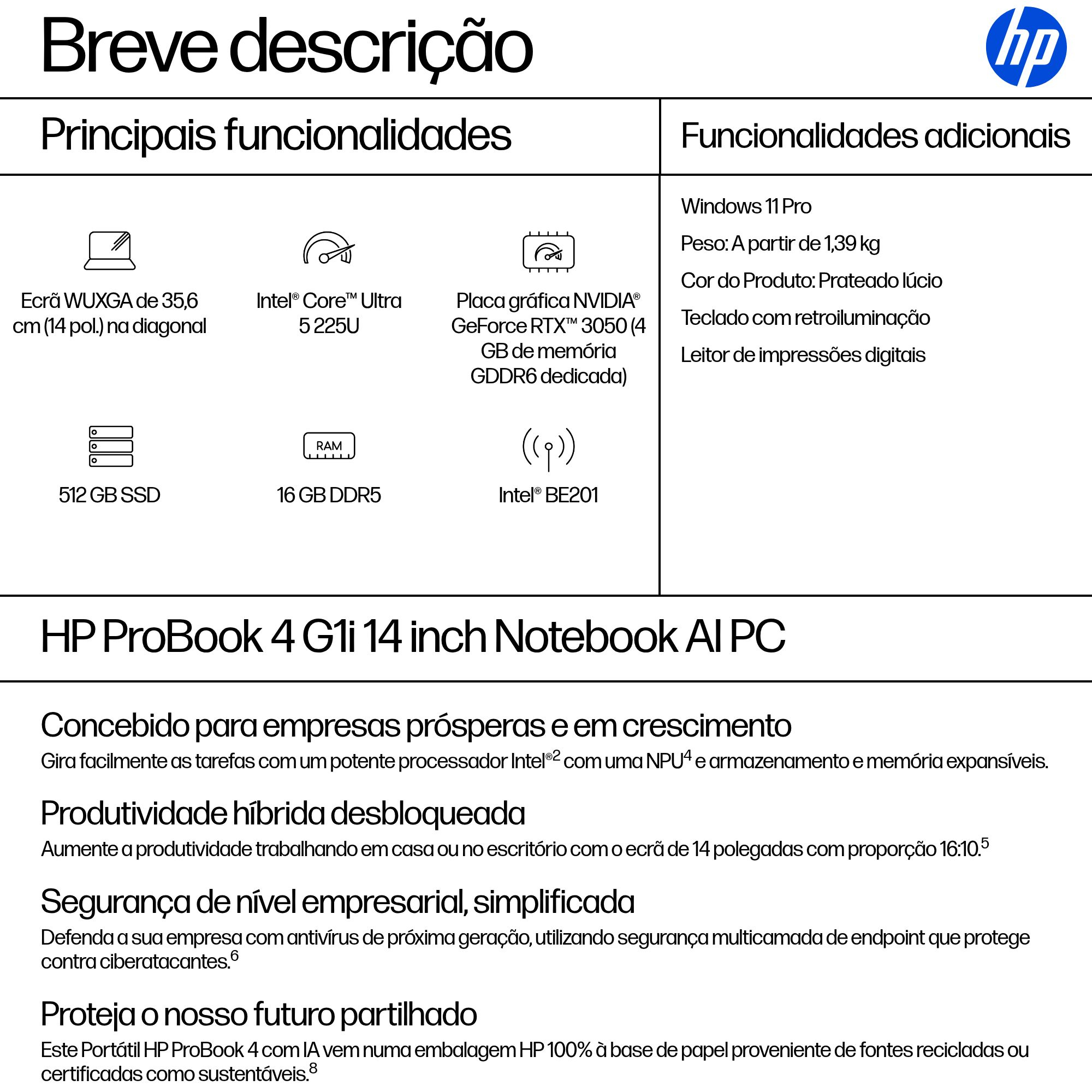 HP ProBook 4 G1i 14 inch Notebook AI PC Intel Core Ultra 5 225U Computador portátil 35,6 cm (14") WUXGA 16 GB DDR5-SDRAM 512 GB SSD Wi-Fi 7 (802.11be) Windows 11 Pro