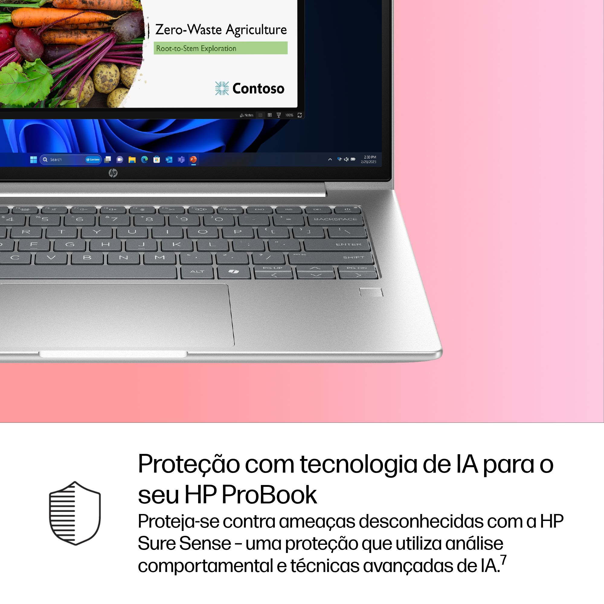 O Portátil HP ProBook 4 G1i de 14 polegadas com IA oferece às empresas em crescimento desempenho profissional, segurança multicamada de endpoint[6], durabilidade e facilidade de upgrade do hardware. Equipado com o mais recente processador Intel[2] com uma NPU de 11 TOPS[4] e uma longa autonomia da bateria, este PC repleto de funcionalidades está preparado para o futuro para produtividade a longo prazo e exploração de IA.