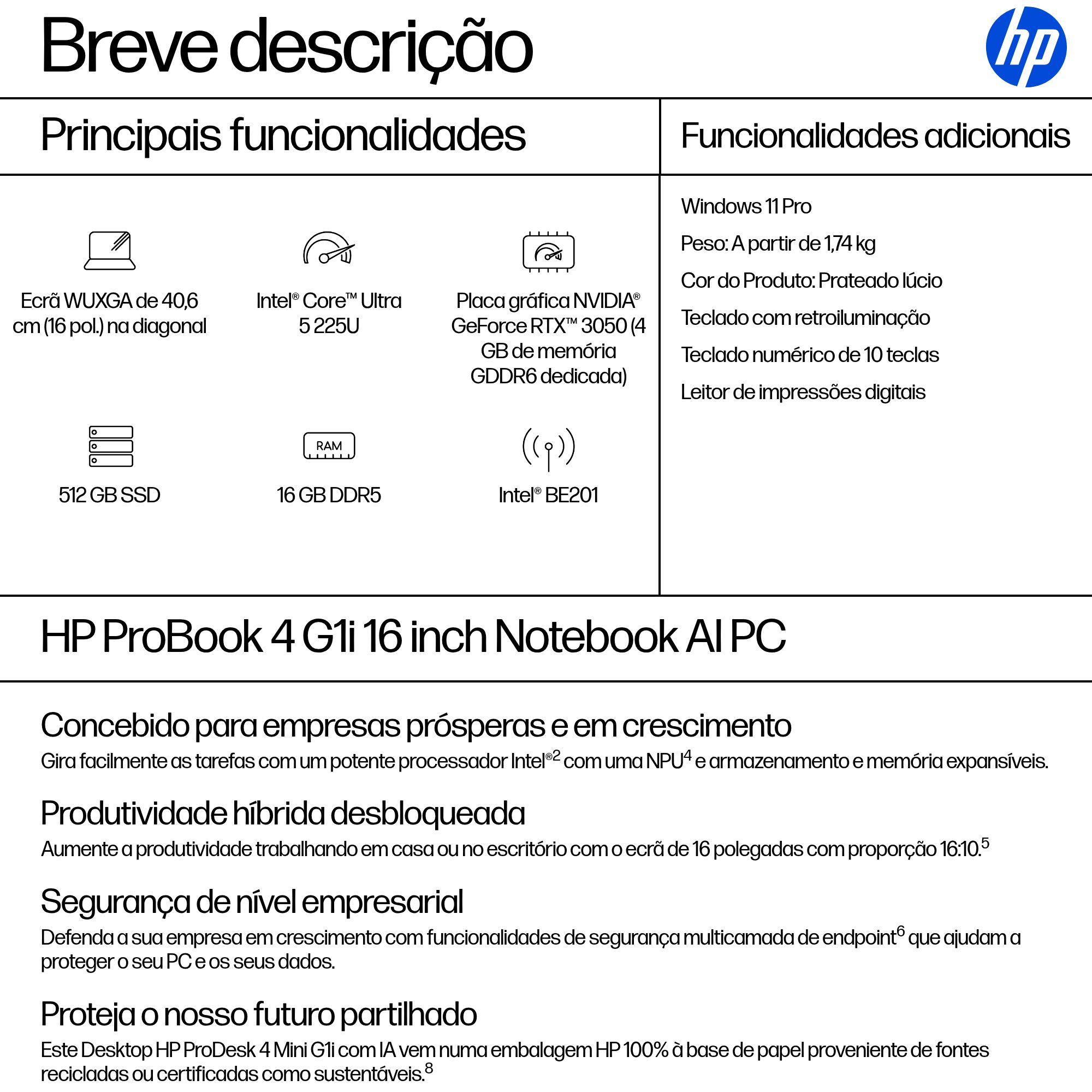 O Portátil HP ProBook 4 G1i de 16 polegadas com IA oferece às empresas em crescimento desempenho profissional, segurança multicamada de endpoint[6], durabilidade e facilidade de upgrade do hardware. Equipado com o mais recente processador Intel[2] com uma NPU de 11 TOPS[4] e uma longa autonomia da bateria, este PC repleto de funcionalidades está preparado para o futuro para produtividade a longo prazo e exploração de IA.