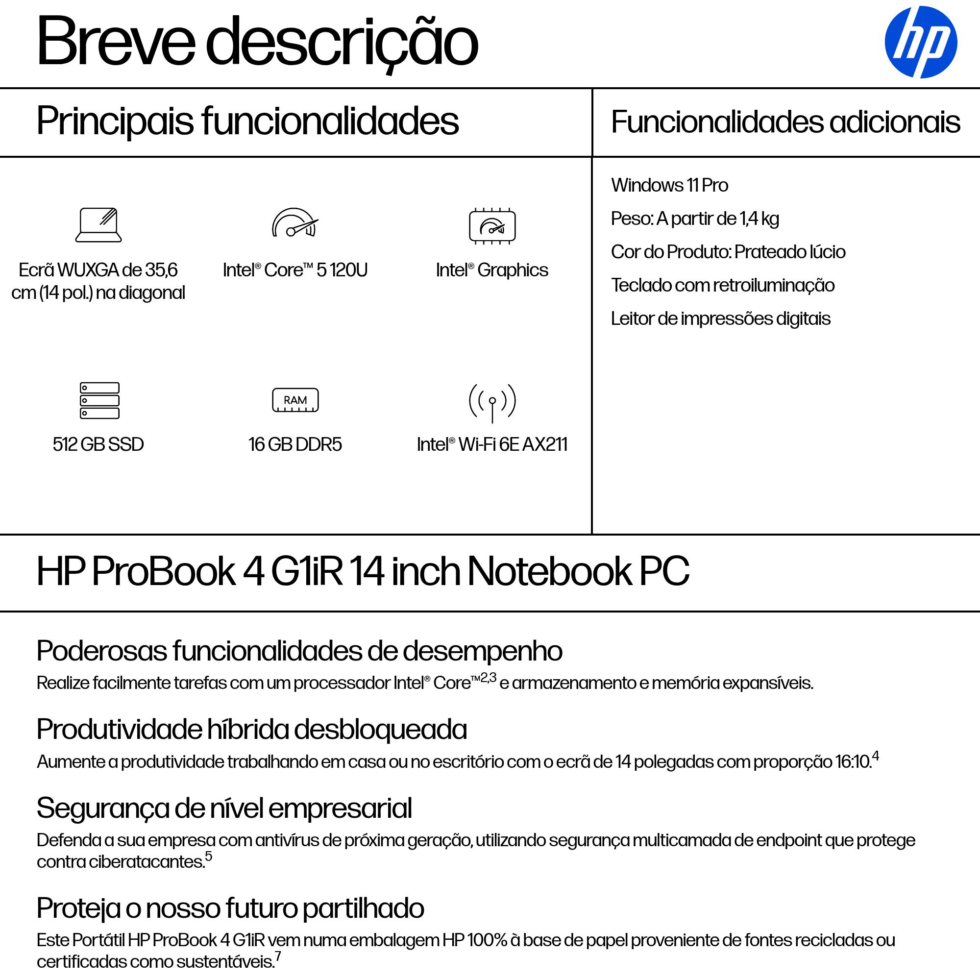 O Portátil HP ProBook 4 G1iR de 14 polegadas oferece às empresas em crescimento desempenho profissional, segurança multicamada de endpoint[5], durabilidade e facilidade de upgrade do hardware. Equipado com o mais recente processador Intel[2] e com uma longa autonomia da bateria, este portátil repleto de funcionalidades está preparado para o futuro para uma produtividade a longo prazo e ajuda a permitir o trabalho híbrido.