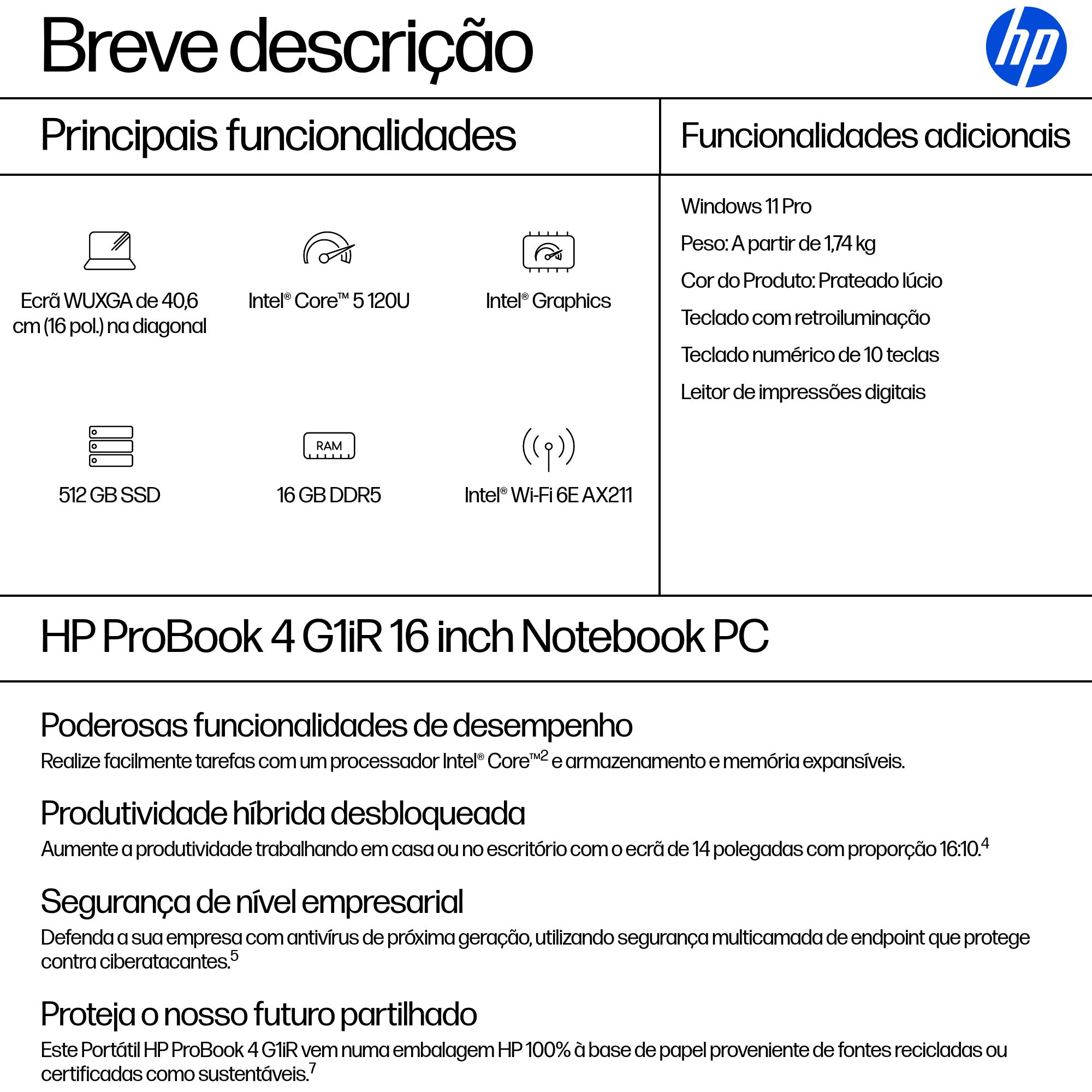 O Portátil HP ProBook 4 G1iR de 16 polegadas oferece às empresas em crescimento desempenho profissional, segurança multicamada de endpoint[5], durabilidade e facilidade de upgrade do hardware. Equipado com o mais recente processador Intel[2] e com uma longa autonomia da bateria, este portátil repleto de funcionalidades está preparado para o futuro para uma produtividade a longo prazo e ajuda a permitir o trabalho híbrido.