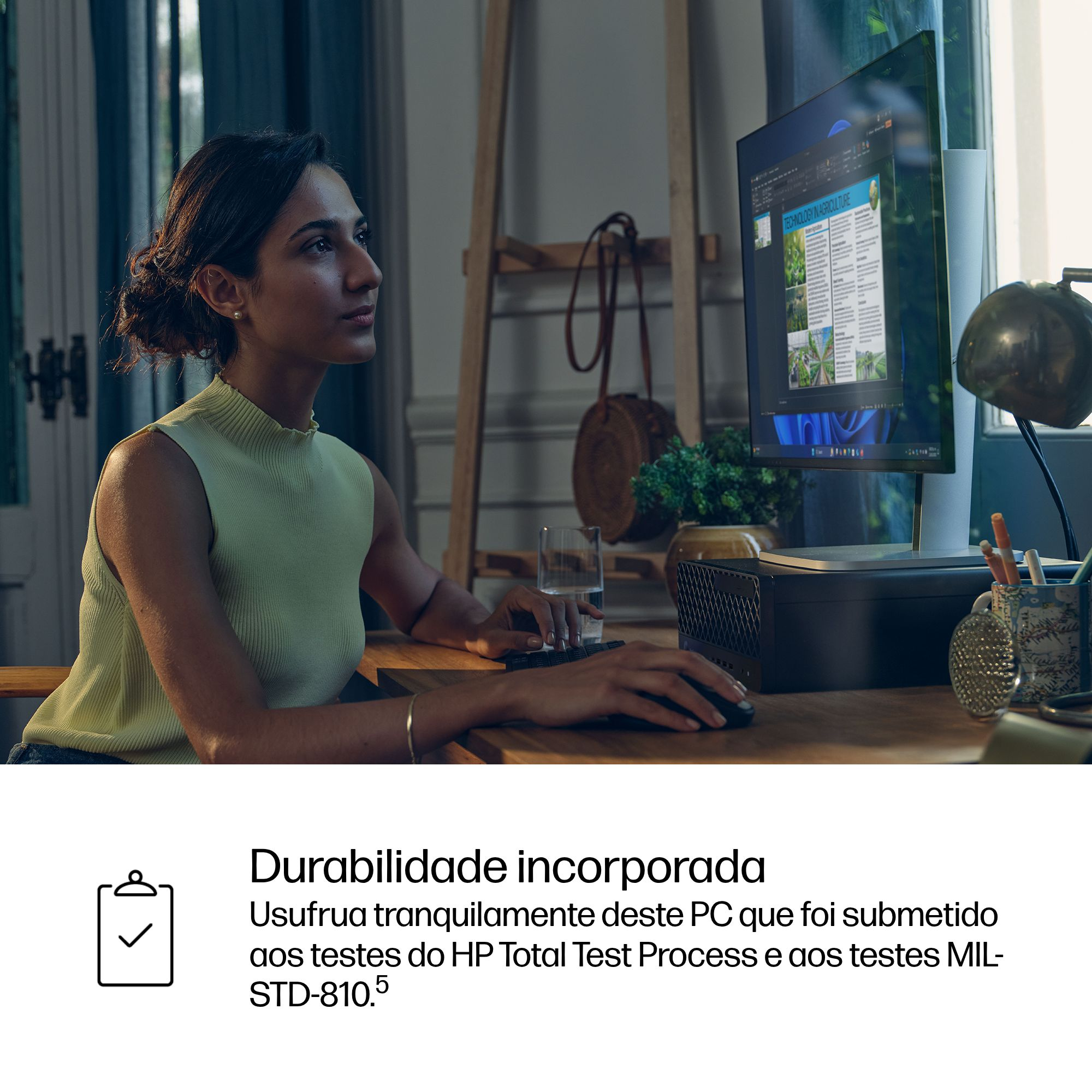 Este PC compacto foi submetido aos testes MIL-STD-810[7] e aos testes do HP Total Test Process[8] para garantir que cumpre ou excede os padrões de durabilidade da HP.
