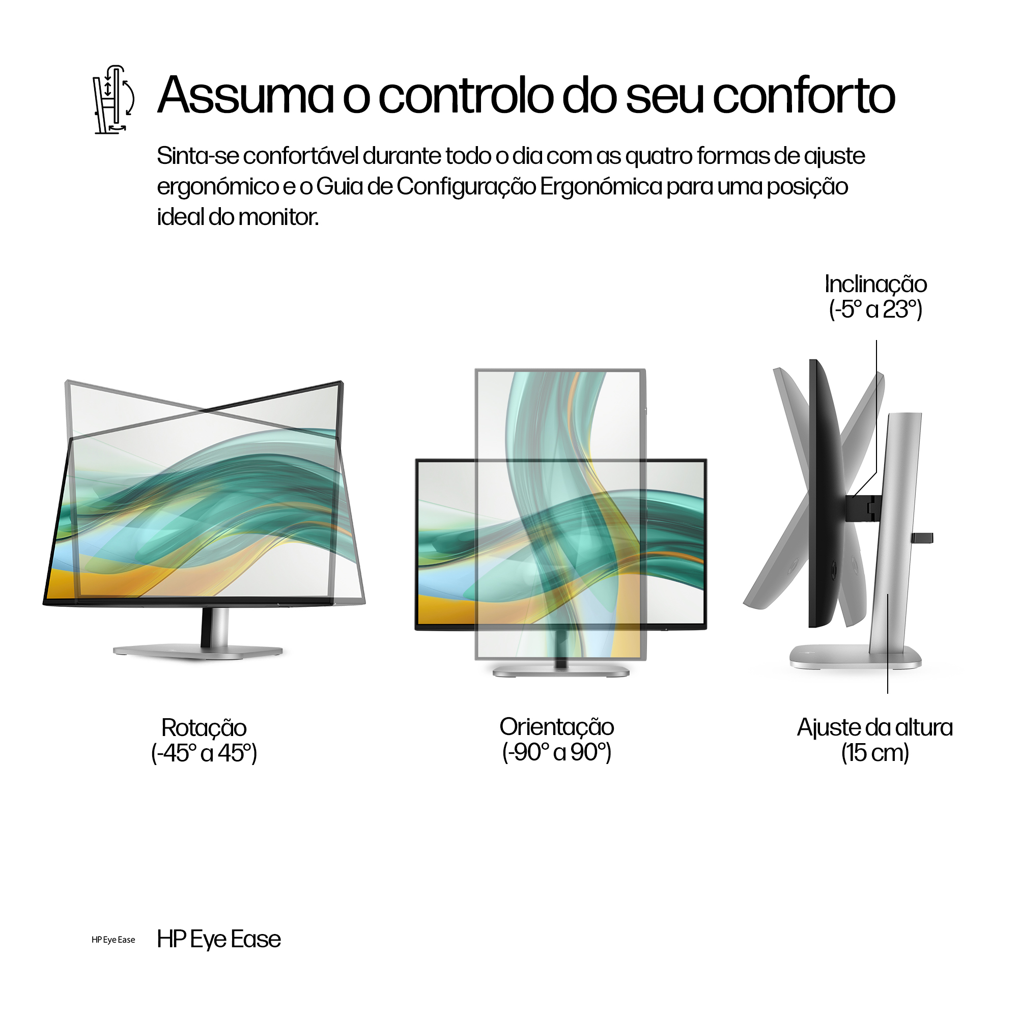 Encontre uma forma de se manter confortável durante todo o dia com as quatro formas de ajuste ergonómico otimizadas pelo Guia de Configuração Ergonómica<sup>[5]</sup> detalhado no HP Display Center.<sup>[9]</sup> Mantenha os seus olhos confortáveis com o HP Eye Ease, que reduz a emissão de luz azul sem afetar a precisão de cor.