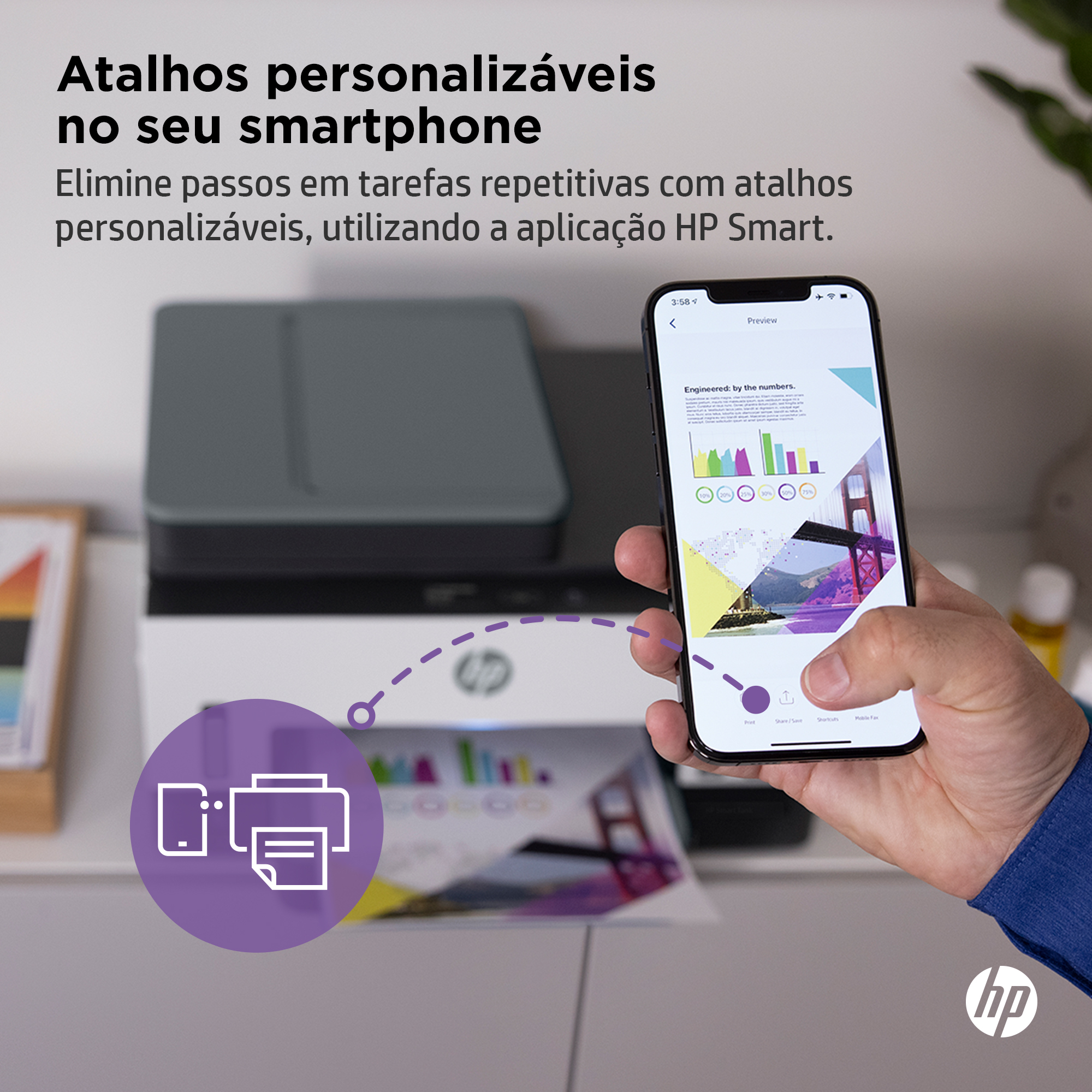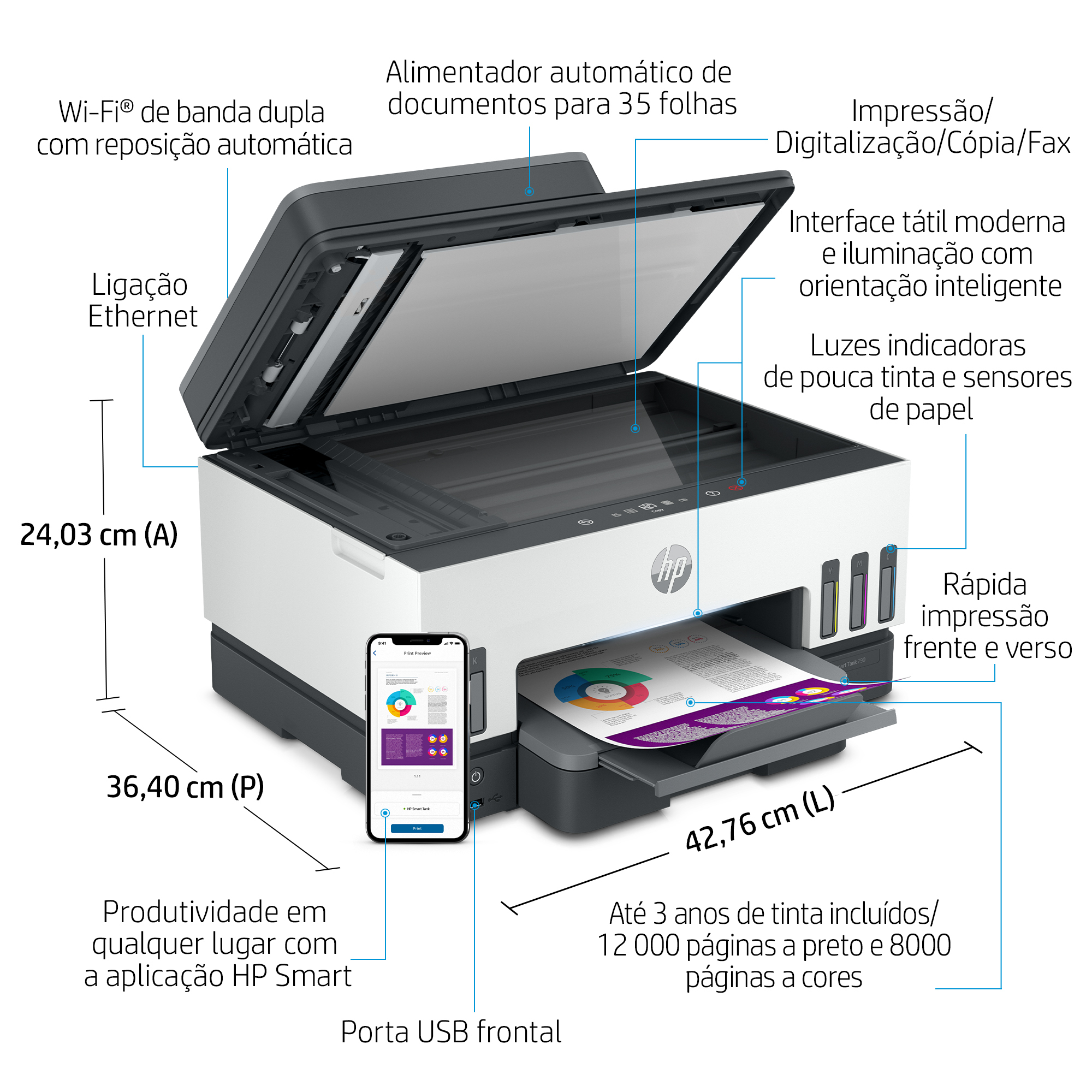 Imprima e digitalize a partir do seu smartphone com a aplicação HP Smart.[2] Usufrua de digitalização avançada durante 12 meses com a HP Smart Tank.[9]