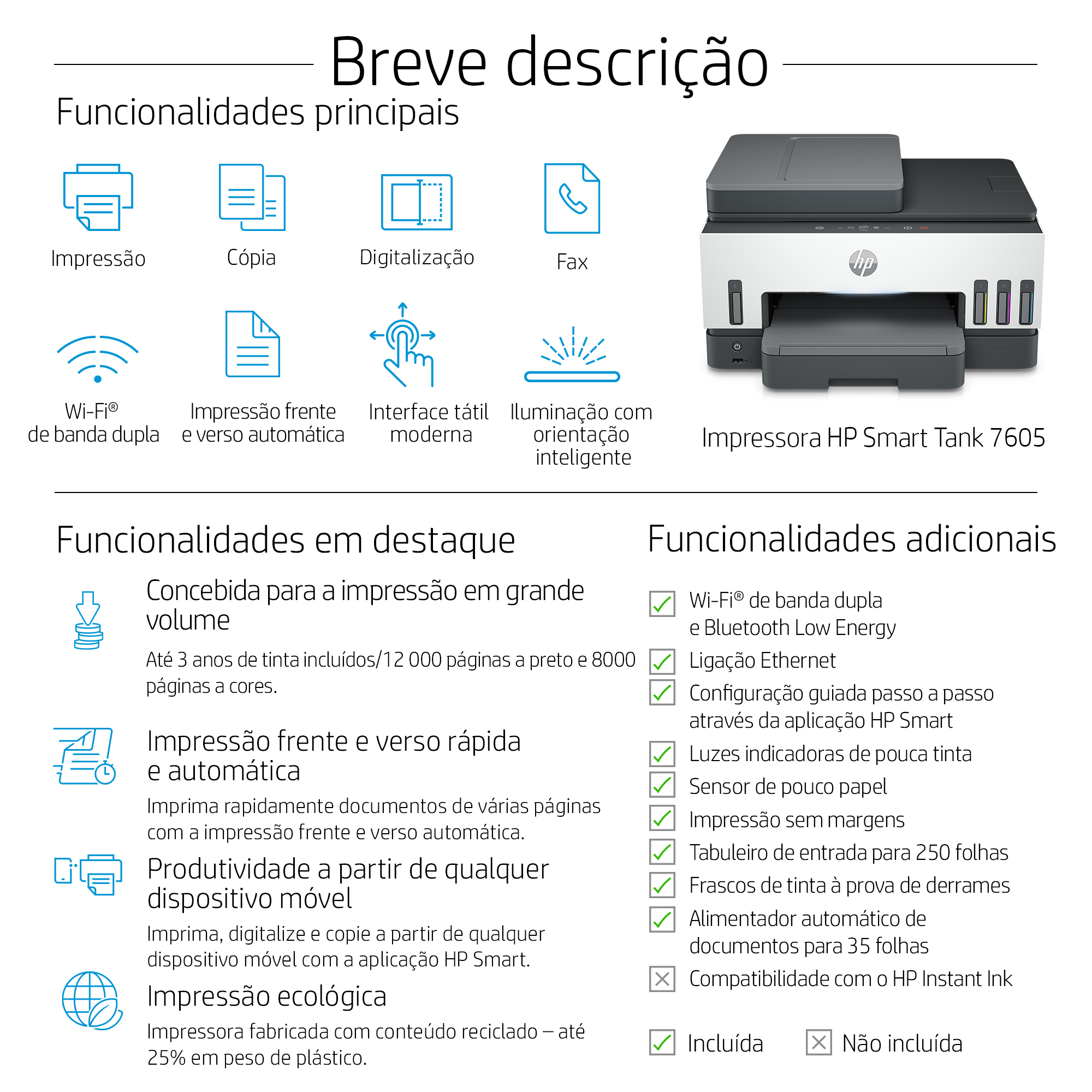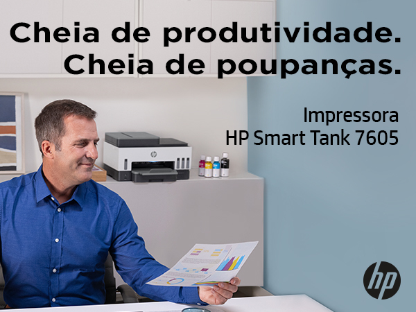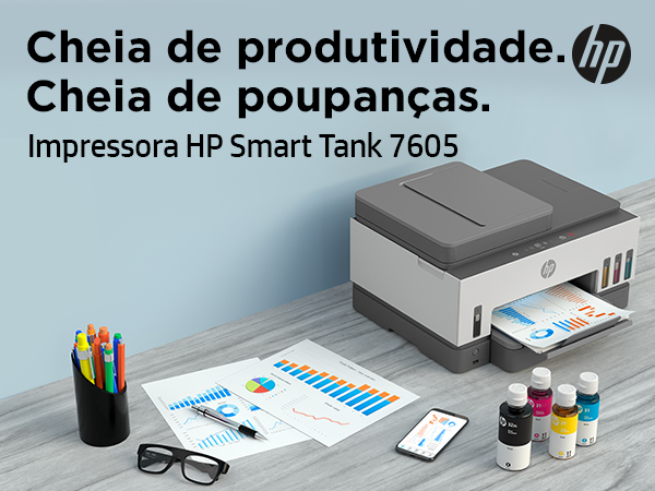 Frascos de tinta HP Originais incluídos permitem imprimir até 12 000 páginas a preto e branco ou até 8000 páginas a cores.[6]