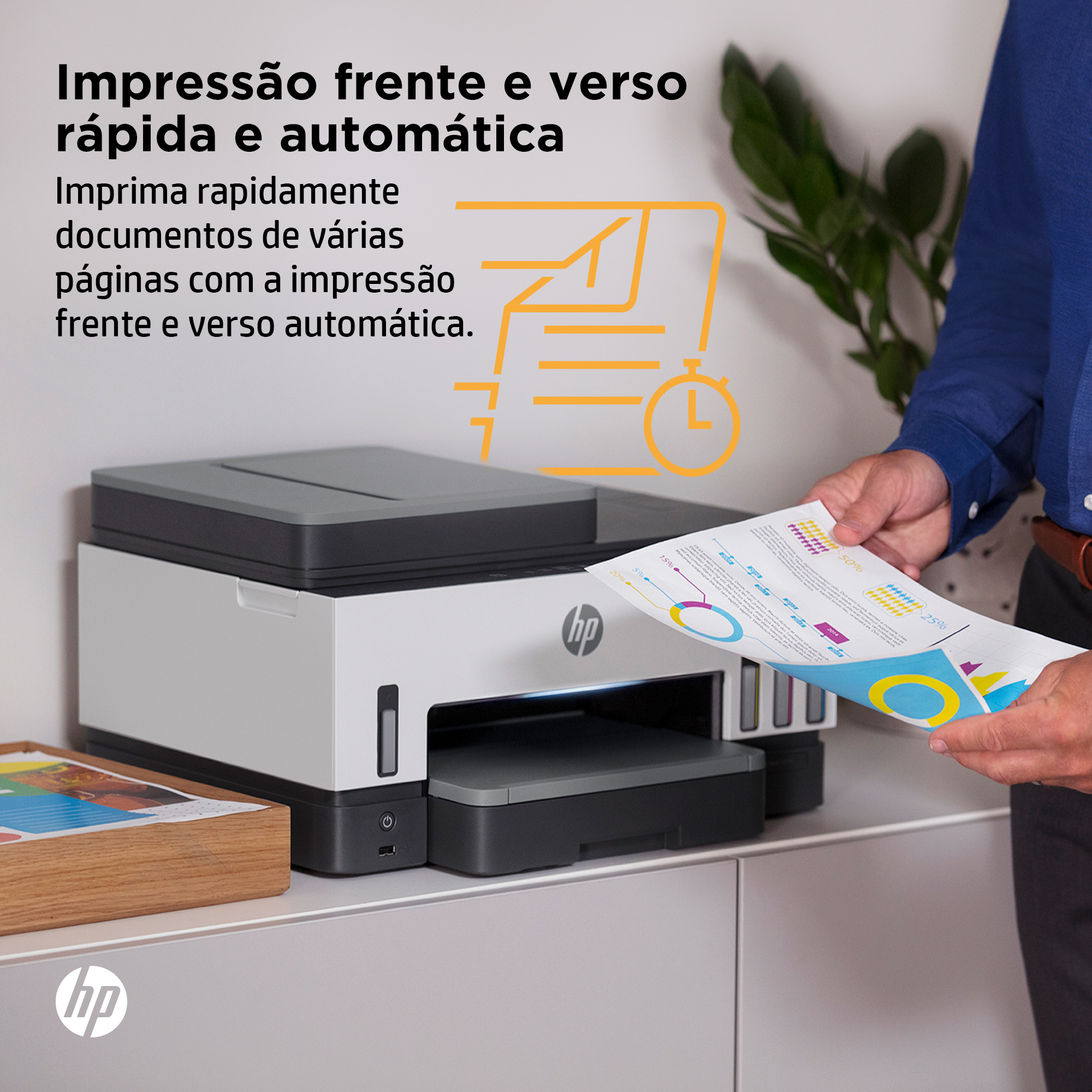 Imprima rapidamente documentos de várias páginas com a impressão frente e verso automática.