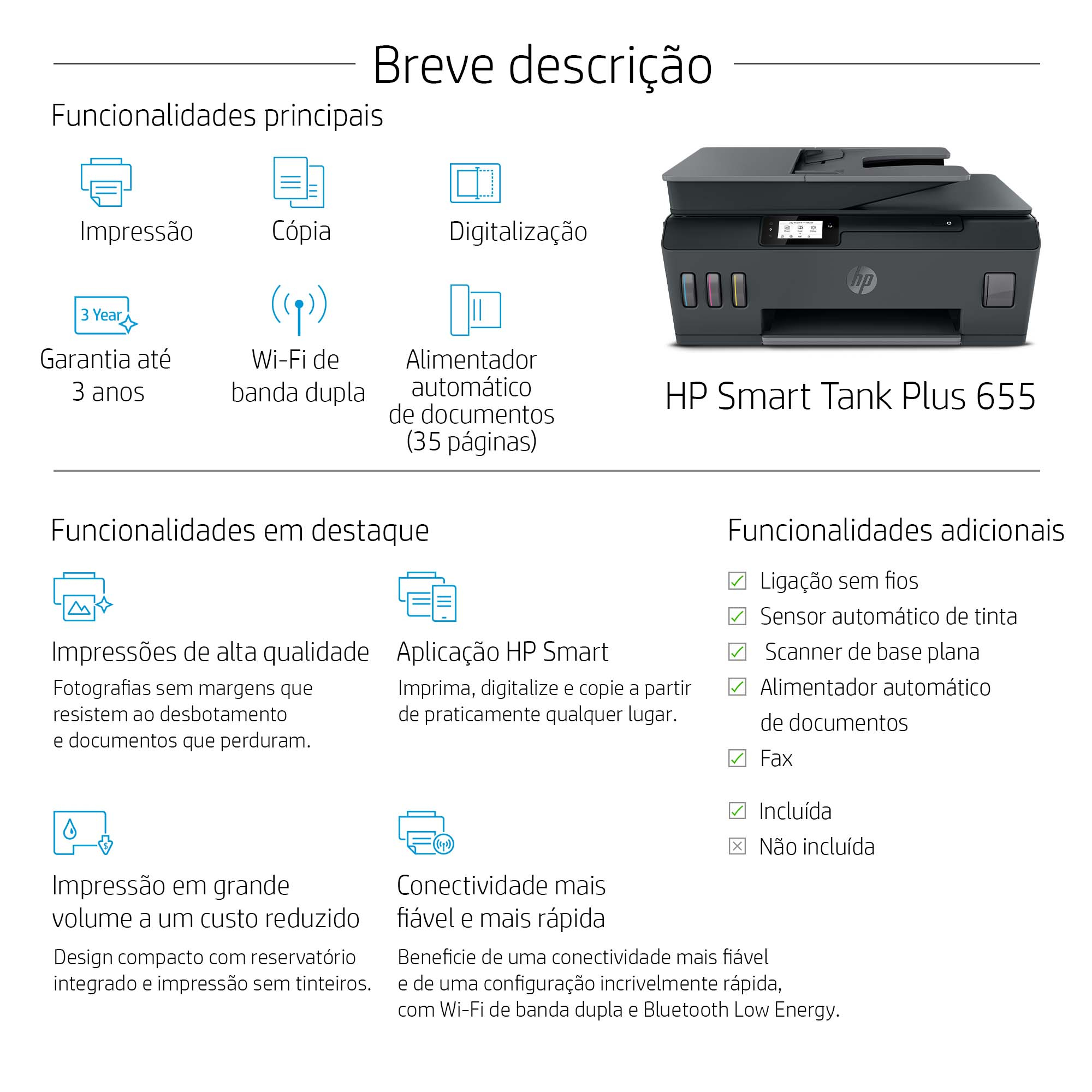 | Conteúdos | Multifunções HP Smart Tank Plus 655 Wireless; 2 Frascos de Tinta HP Originais 32XL Preto (135 ml); Frasco de Tinta HP Original 31 Ciano (70 ml); Frasco de Tinta HP Original 31 Magenta (70 ml); Frasco de Tinta HP Original 31 Amarelo (70 ml); Folheto com advertências relativas aos tinteiros/frascos de tinta; Folheto de reacondicionamento; Guia de configuração; Guia de referência; Folheto com informações regulamentares; Folheto PT; Folheto com informações regulamentares sobre a RoH-EAC; Cabo de alimentação (Para saber mais informações sobre enchimento e rendimento, aceda a http://www.hp.com/go/learnaboutsupplies) |