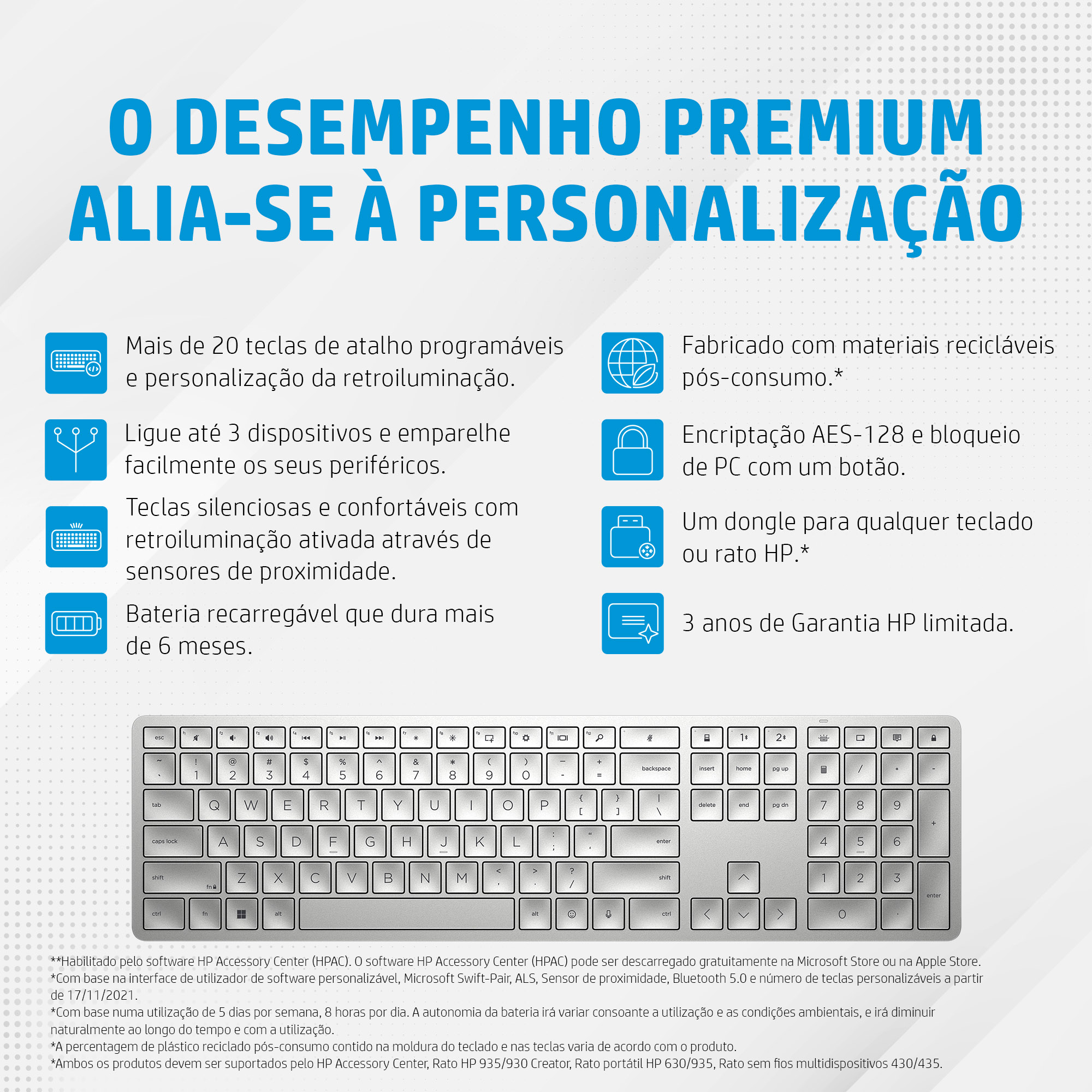 Personalize o seu teclado com o HP Accessory Center (HPAC)[1] e poupe tempo programando mais de 20 teclas com atalhos para as aplicações mais utilizadas. Além disso, pode personalizar a retroiluminação ao ativá-la ou desativá-la, ajustando a intensidade da luz, bem como o temporizador do modo inativo.