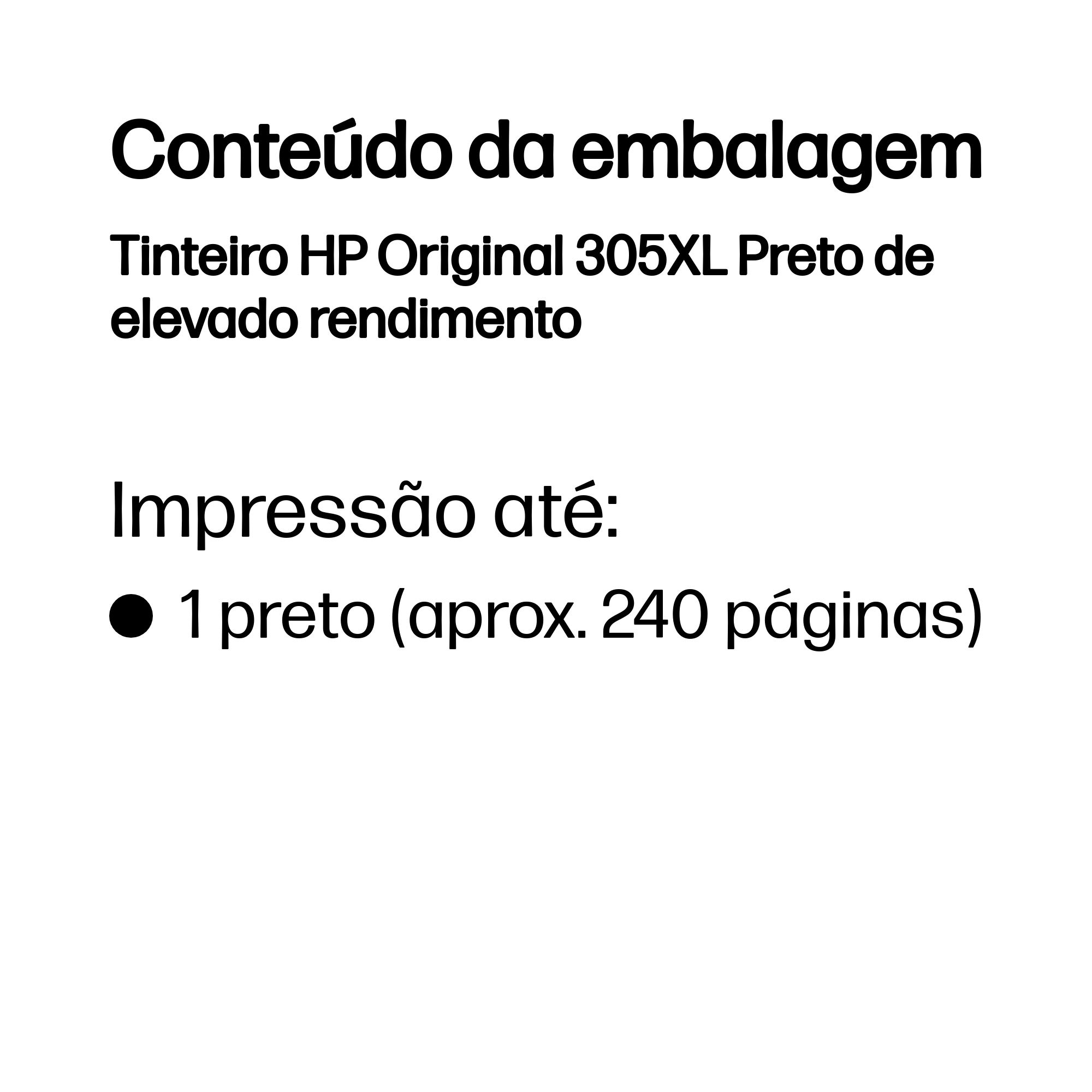 | Conteúdos | HP 305XL Mid Yield Black Original Ink Cartridge |